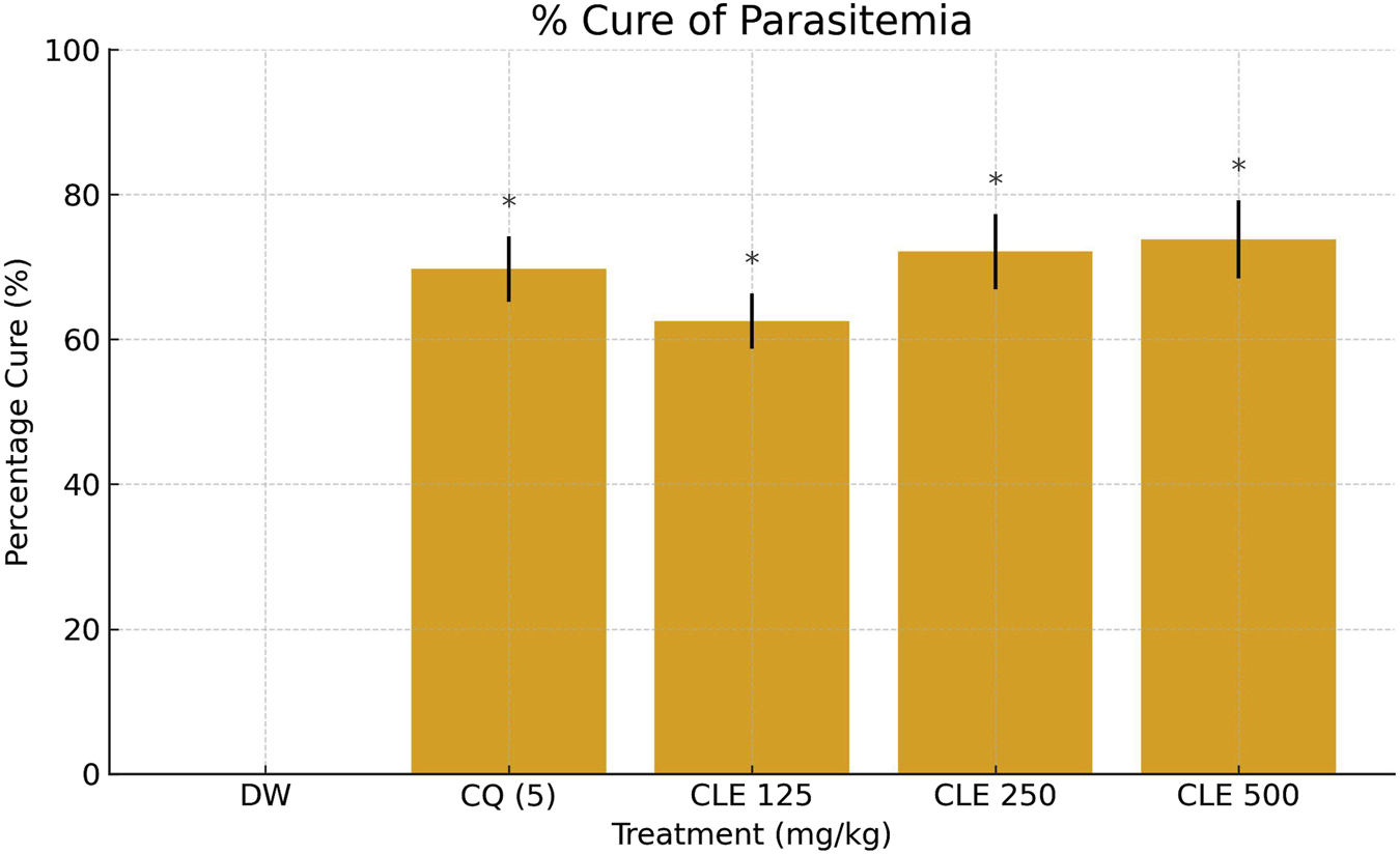 Percentage cure of parasitemia in P. berghei–infected mice treated with CLE of Vernonia ambigua *(125–500 mg/kg), chloroquine (CQ, 5 mg/kg), and vehicle control (DW). Data are expressed as mean ± SD (n = 5). Statistical significance was assessed using one-way ANOVA followed by Dunnett’s post hoc test. *p < 0.05 vs. DW; **p < 0.05 vs. CQ.