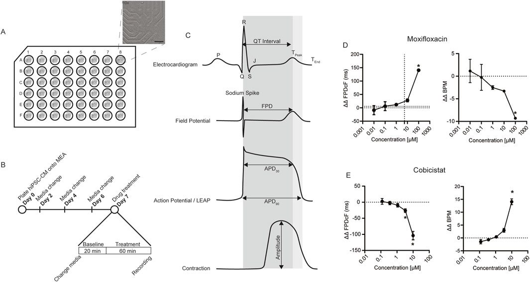 Figure 1. Nonclinical cardiac NAM. (A) Schematic of hiPSC-CMs plated on 48-well MEA plate insert indicates 16-electrode grid (region of interest). Bright field image of hiPSC-CMs covering electrodes (×10 magnification, scale bar 400 µm). (B) Experimental timeline and drug treatment schedule. (C) Example waveforms of interest demonstrating key nonclinical electrophysiological and contractile parameters relative to clinical electrocardiogram. APD, action potential duration. FPD, field potential duration. MEA, Multielectrode Array. (D) Moxifloxacin ΔΔ FPDcF, ΔΔ BPM, Data are mean ± SEM. n = 4 to 6 per condition, Vehicle vs. moxifloxacin (*p-value <0.05). (E) Cobicistat ΔΔ FPDcF, ΔΔ BPM, Data are mean ± SEM. n = 6 per condition, Vehicle vs. cobicistat (*p-value <0.05).