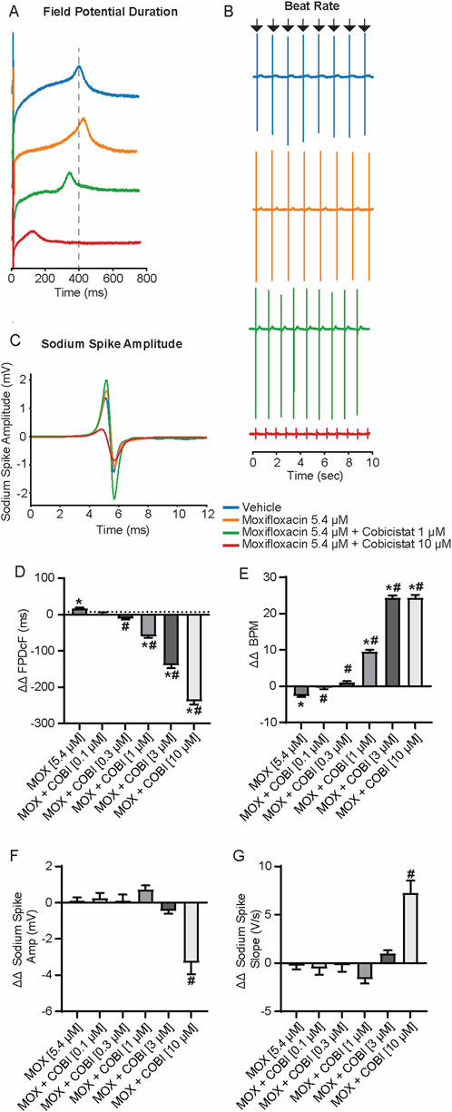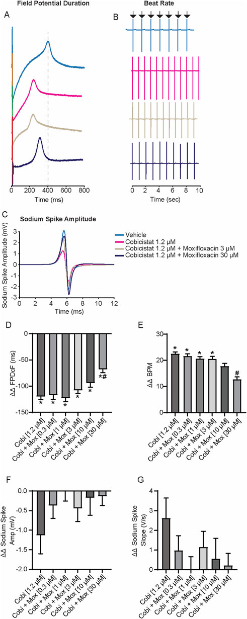 Figure 2. Electrophysiological Effects of Concomitant Moxifloxacin (Cmax) and Cobicistat treatment. (A) Representative field potential waveform from hiPSC-CMs treated with moxifloxacin (Cmax) and various concentrations of cobicistat. (B) Representative field potential recordings illustrating drug treatment effects on spontaneous beat rate. (C) Representative sodium spike waveforms demonstrating drug treatment effects on sodium spike amplitude. (D–G) Summary data graphs of field potential duration (D) ΔΔ FPD (E) ΔΔ BPM (F) ΔΔ Sodium Spike Amplitude, and (G) ΔΔ Sodium Spike Slope. Data are mean ± SEM. n = 5 to 14 per condition. Vehicle vs. treatment (*p-value <0.05); moxifloxacin 5.4 µM vs. moxifloxacin + cobicistat (#p-value <0.05).