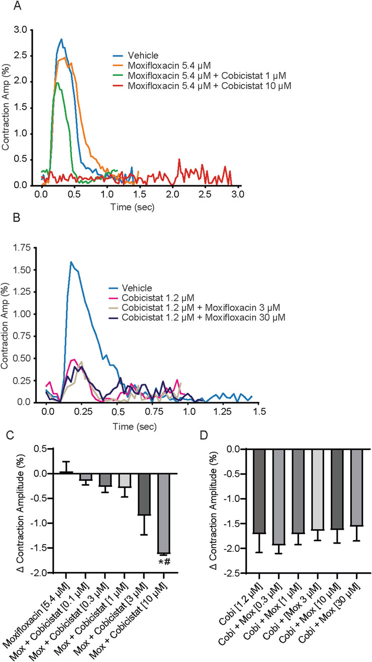 Figure 4. Effects of concomitant Moxifloxacin and Cobicistat treatment on hiPSC-CM Contraction Amplitude. (A) Representative contraction traces for hiPSC-CMs treated with moxifloxacin (Cmax) and various concentrations of cobicistat. (B) Summary data graphs of contraction amplitude. Data are mean ± SEM. n = 4 to 6 per condition. Vehicle vs. treatment (*p-value <0.05); moxifloxacin 5.4 µM vs. moxifloxacin + cobicistat (#p-value <0.05). (C) Representative contraction traces for hiPSC-CMs treated with cobicistat (Cmax) and various concentrations of moxifloxacin. (D) Summary data graphs of contraction amplitude. Data are mean ± SEM. n = 4 to 6 per condition. Vehicle vs. treatment (non-significant); cobicistat 1.2 µM vs. cobicistat + moxifloxacin (non-significant).