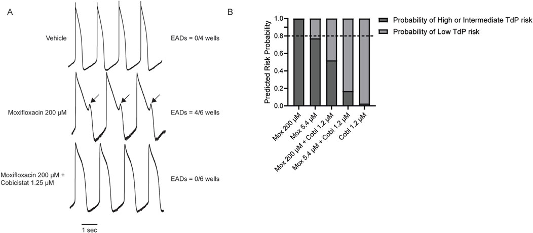 While measuring the FPDcF with supratherapeutic concentrations of moxifloxacin, 200 μM, we observed type A arrhythmic-like events (i.e., biphasic repolarization wave), suggesting the presence of early after depolarizations (EADs) (Supplementary Figure S2) (Blinova et al., 2018; Blinova et al., 2017). Therefore, we used LEAP (local extracellular action potential) to verify the presence of EADs following moxifloxacin treatment and to determine if cobicistat could reduce their frequency. Indeed, we observed EADs in (4/6 wells) treated with moxifloxacin (200 µM) (Figure 5A), while subsequent treatment with 1.2 µM cobicistat reduced their frequency (0/6 wells). Next, we compared the risk of TdP with moxifloxacin alone and in combination with increasing concentrations of cobicistat to determine if cobicistat reduces moxifloxacin-induced TdP risk categorization. For this assessment, we utilized the CiPA TdP risk prediction model which uses in vitro compound electrophysiological responses as model predictors to categorize TdP risk as low vs. high or intermediate (Blinova et al., 2018). As expected, we observed that moxifloxacin is categorized as high or intermediate TdP risk, while concomitant treatment with cobicistat reduced this to a low TdP risk category (Figure 5B) consistent with cobicistat alone displaying low TdP risk categorization. Taken together, these data suggests that treatment with moxifloxacin and cobicistat together may display reduced cardiac liability relative to moxifloxacin alone.