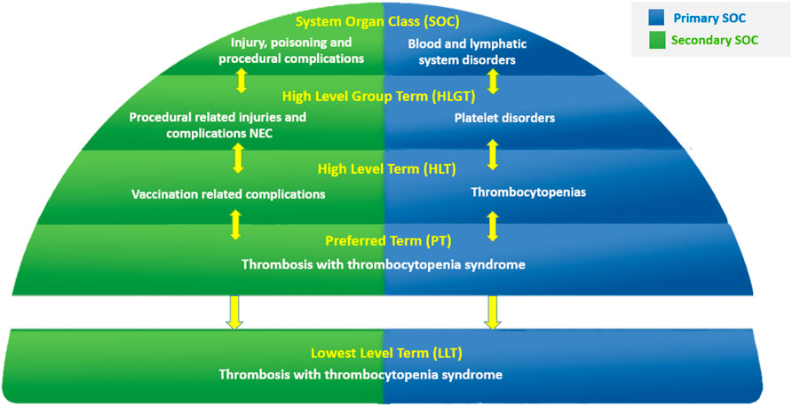 MedDRA is structured as a five-level hierarchy (Figure 1), ranging from very specific to more general terms: Lowest Level Terms (LLTs), Preferred Terms (PTs), High Level Terms (HLTs), High Level Group Terms (HLGTs), and System Organ Classes (SOCs). It is grouped into 27 SOCs that represent parallel axes (Bousquet et al., 2014). This characteristic, known as “multiaxiality,” allows a term to be represented in more than one SOC and to be grouped by different classifications, enabling retrieval and presentation via multiple data sets. Multiaxial links of terms are pre-assigned, allowing automatic assignment of grouping terms higher in the hierarchy and ensuring comprehensive and consistent data retrieval, regardless of which SOC is selected at retrieval. Each MedDRA PT is assigned a primary hierarchy and, in some cases, secondary hierarchies (Brown et al., 1999). MedDRA also includes “Standardised MedDRA Queries (SMQs)”, which are groupings of MedDRA terms at the PT level that relate to a defined medical condition or area of interest (Brown et al., 1999). SMQs are intended to aid in the identification and retrieval of potentially relevant individual case safety reports (Chang et al., 2017; Hartford et al., 2006; Brown, 2004). The included terms may relate to signs, symptoms, diagnoses, syndromes, physical findings, laboratory and other physiologic test data, etc. The only LLTs represented in an SMQ are those that link to a PT used in the SMQ; all others are excluded.