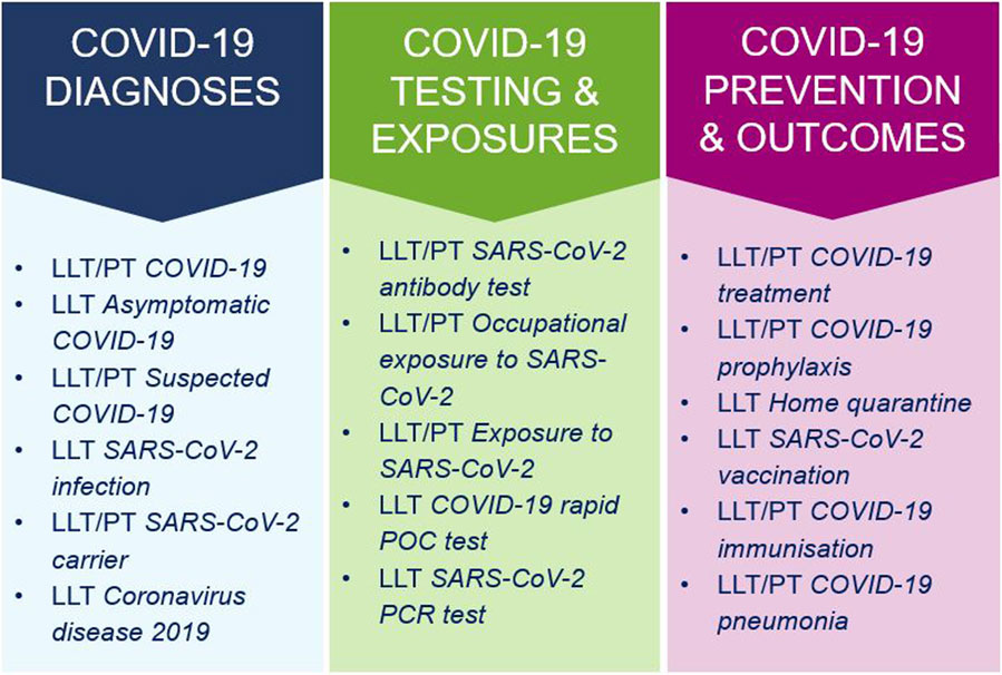 Figure 2. Categories and examples of COVID-19 terms in the out-of-cycle MedDRA release 23.0 (April 2020). LLT, Lowest Level Term; PT, Preferred Term.