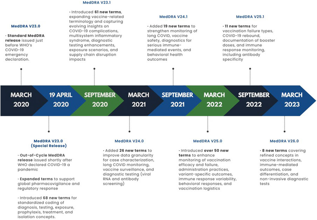 The timeline of MedDRA releases during the COVID-19 pandemic reflects the rapid, stepwise, and iterative approach taken to address emerging clinical and regulatory needs. To visually illustrate this, Figure 3 presents a chronological summary of key versions from 23.0 (March 2020) through 26.0 (March 2023), mapping each release to its main COVID-19 terminology updates from early diagnostic and treatment concepts to vaccine safety monitoring, long COVID surveillance, and variant-specific outcome assessment.