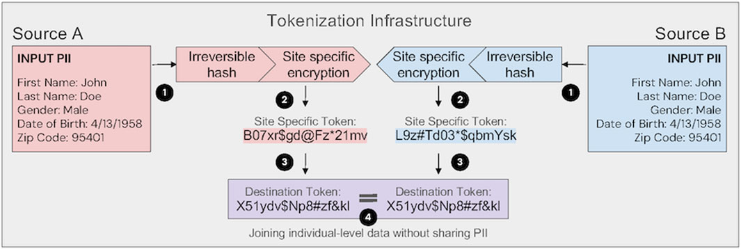 Flowchart of tokenization infrastructure for joining data from two sources, Source A and Source B, without sharing PII. Both sources contain identical personal information, which undergoes irreversible hashing and site-specific encryption to produce unique site-specific tokens. These tokens are further processed to create a shared destination token, facilitating data merging while maintaining privacy.
