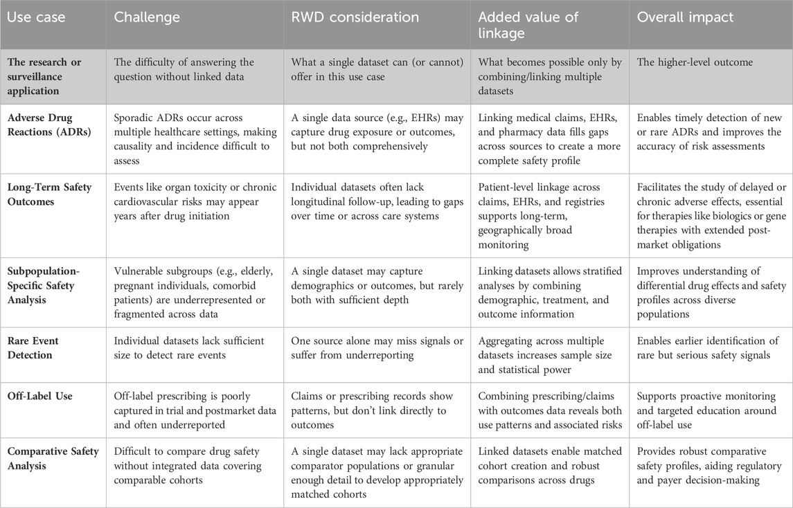 Ultimately, linking existing RWD has the potential to significantly reduce the reliance on costly, investigator-led studies for post-market surveillance, offering a more resource-efficient solution for long-term safety monitoring. Table 1 presents the key considerations for utilizing RWD as well as the added benefit of data linkage in safety surveillance.