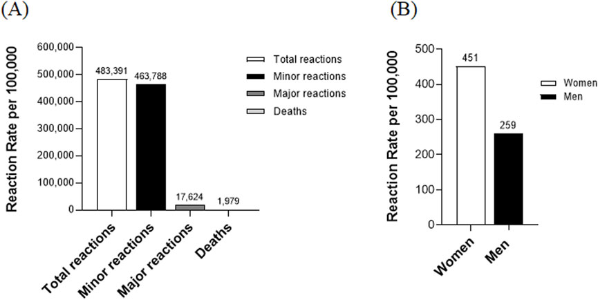 Figure 1. Analysis of adverse reactions following COVID-19 vaccination. (A) Distribution of adverse reaction types: This figure illustrates the distribution of adverse reaction types following COVID-19 vaccination. Minor reactions: The number of cases with minor adverse reactions. Major reactions: The number of cases with major adverse reactions. Deaths: The number of death cases reported post-vaccination. (B) Adverse reaction rates by gender: This section of the figure analyzes adverse reaction rates based on gender.