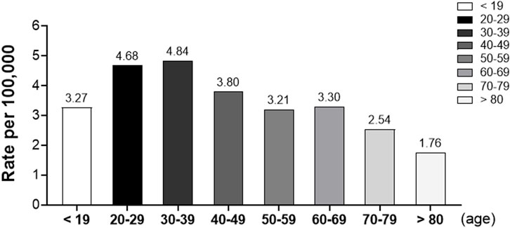 When analyzed by age group, the rates of adverse reactions were highest in subjects aged 30–39 (4.84 per 100,000) and 20–29 (4.68 per 100,000), somewhat high in subjects aged 40–49 (3.80 per 100,000), 60–69 (3.30 per 100,000), ≤19 (3.27 per 100,000), and 50–59 (3.21 per 100,000) years, and lowest in subjects aged 70–79 (2.54 per 100,000) and ≥80 (1.76 per 100,000) years. The highest rates were observed in the 30–39 and 20–29 age groups, with rates of 4.84 and 4.68 per 100,000, respectively. The rates decreased progressively in older age groups, with the lowest rate observed in individuals aged 80 and above, at 1.76 per 100,000. This data highlights age-related variations in the reporting rate of adverse reactions following vaccination (Figure 2).