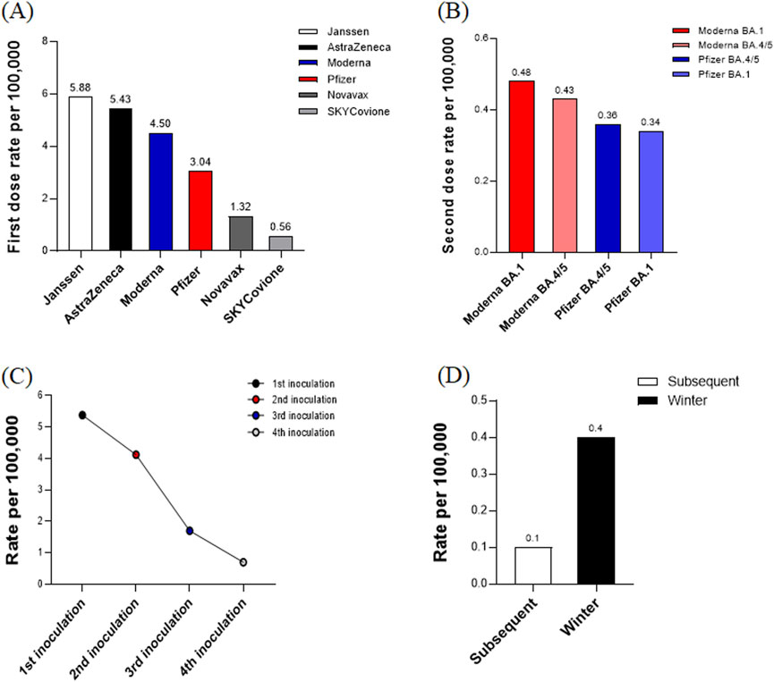 Figure 3. (A) Adverse reaction rates for first dose by vaccine manufacturer. This bar chart illustrates the adverse reaction rates per 100,000 vaccinations for different COVID-19 vaccines after the first dose. The reaction rates are highest for Janssen and AstraZeneca and lowest for SKYCovione, indicating variability in adverse reaction frequency across different manufacturers. (B) Adverse reaction rates for seconddose by vaccine manufacturer. This bar chart shows the adverse reaction rates per 100,000 vaccinations for bivalent COVID-19 vaccines after the second dose. The reaction rates are relatively low across all manufacturers, with the highest rate observed for Moderna (BA.1). (C) Overall adverse reaction rates by dose number. This line graph illustrates the overall adverse reaction rates per 100,000 vaccinations across the first, second, third, and fourth doses of COVID-19 vaccines. (D) Adverse reaction rates for subsequent doses and winter administrations. This bar chart displays the adverse reaction rates per 100,000 vaccinations for subsequent doses and winter administrations of COVID-19 vaccines.