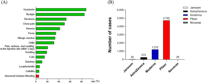 Figure 4. Rates and types of suspected adverse reactions by symptom in COVID-19 vaccine recipients. (A) The ranking of abnormal uterine bleeding as the 15th most common adverse event among COVID-19 vaccine recipients. The condition was reported at a rate of 4.9 per 100,000 vaccinated women. (B) Distribution of 6,288 reported cases of abnormal uterine bleeding by vaccine type. The majority of these cases were associated with the Pfizer vaccine, indicating it had the highest number of reported adverse reaction cases in this category.