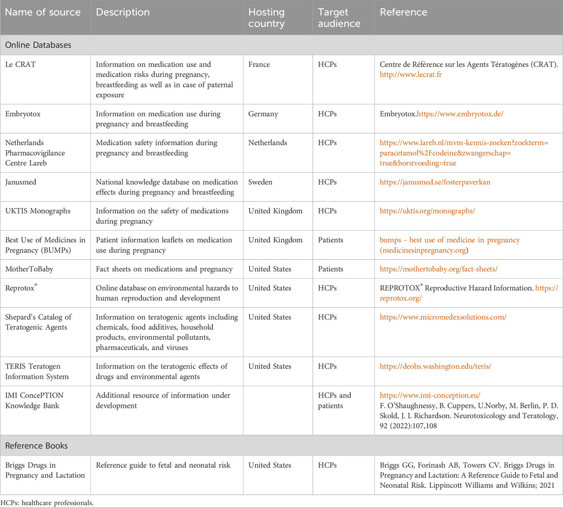 Whilst there is still insufficient evidence regarding the safety of medicines during pregnancy, where evidence does exist, it should be communicated and factored into the risk assessment. Experts in this domain gather and disseminate this information through specialized up-to-date sources (Table 1). These resources provide comprehensive data, risk classification, therapeutic alternatives, and practical guidance for pregnancy follow-up. In addition to reference books, websites, such as UKTIS (www.uktis.org), Embryotox (in German) (Embryotox, 2018), and Le CRAT (in French) (CRAT, 2018; Elefant et al., 2014), serve as reliable online sources for HCP and are accessible for everyone free of charge. BUMPs (www.medicinesinpregnancy.org) and MotherToBaby (in English) are directed towards parents, addressing the need for accessible information. HCP, and sometimes patients, can also obtain information and individual risk assessments from Teratology Information Services (TIS) (Chambers, 2011). These centers of expertise provide free information and advice, prospectively collect high quality data on reported cases of exposure and outcomes, and pool these data at a network level (e.g., MotherToBaby, European Network of Teratology Information Services–ENTIS (European Network of Teratology Information, 2011)) to improve knowledge on drug safety during pregnancy (Lurie et al., 2021). Despite the availability of various resources, there is currently no specialized information source tailored to address the information needs of both HCP and patients simultaneously.