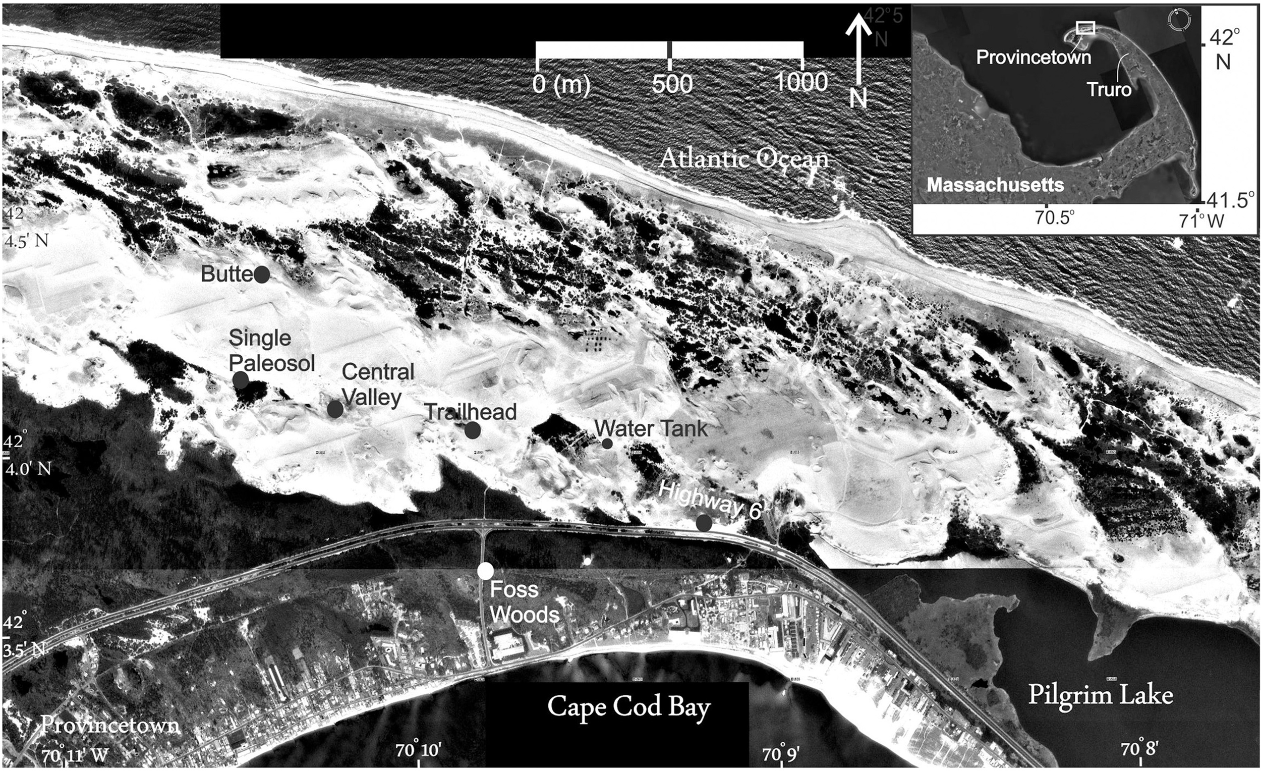 Outer Cape Cod National Seashore showing parabolic dunes and study sites of the informally named Cape Cod dune field (modified from Forman et al., 2008).