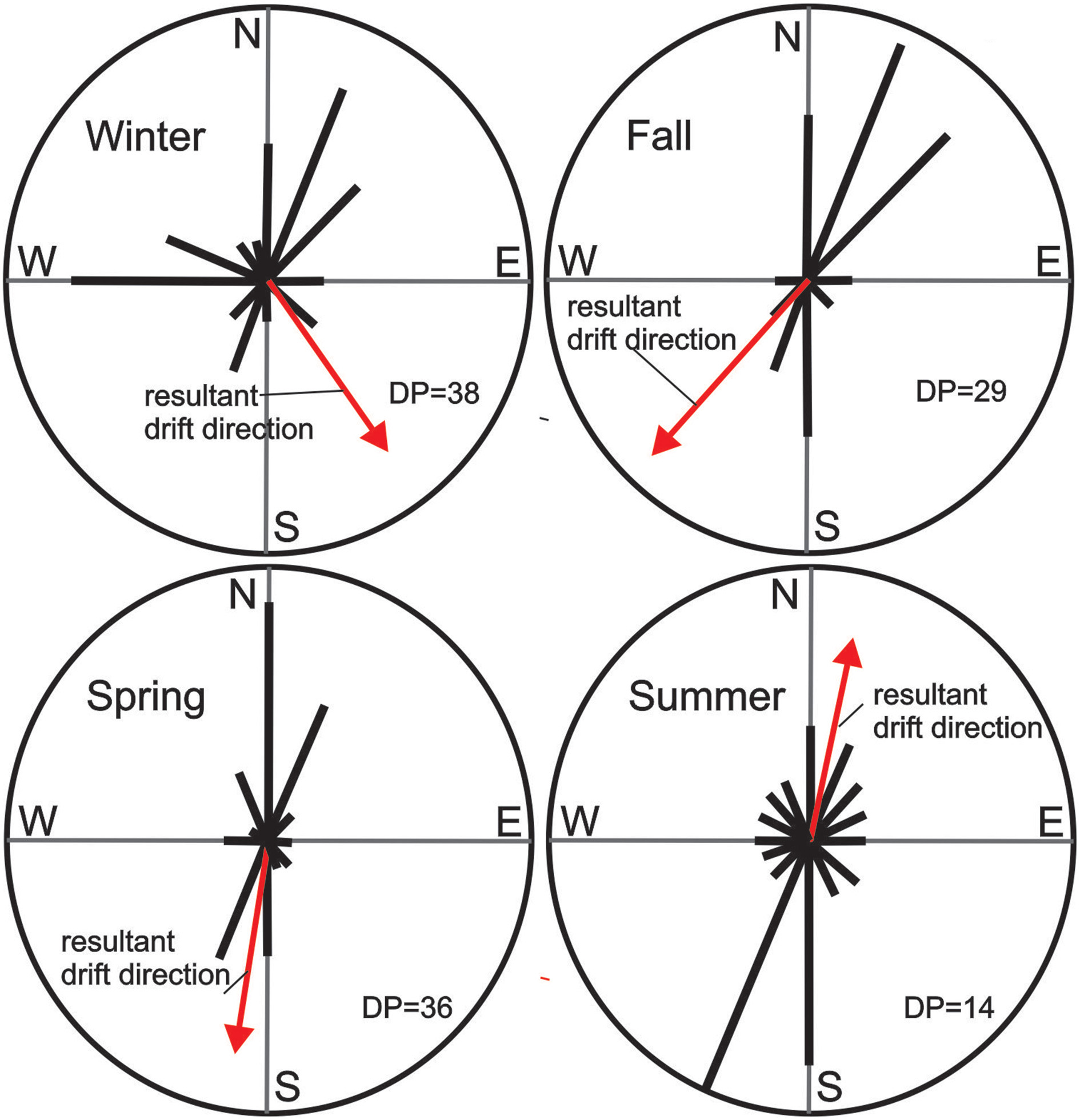 Wind drift potential from hourly wind speeds for AD 2005–2007, Chatham, Massachusetts (after Fryberger and Dean, 1979).