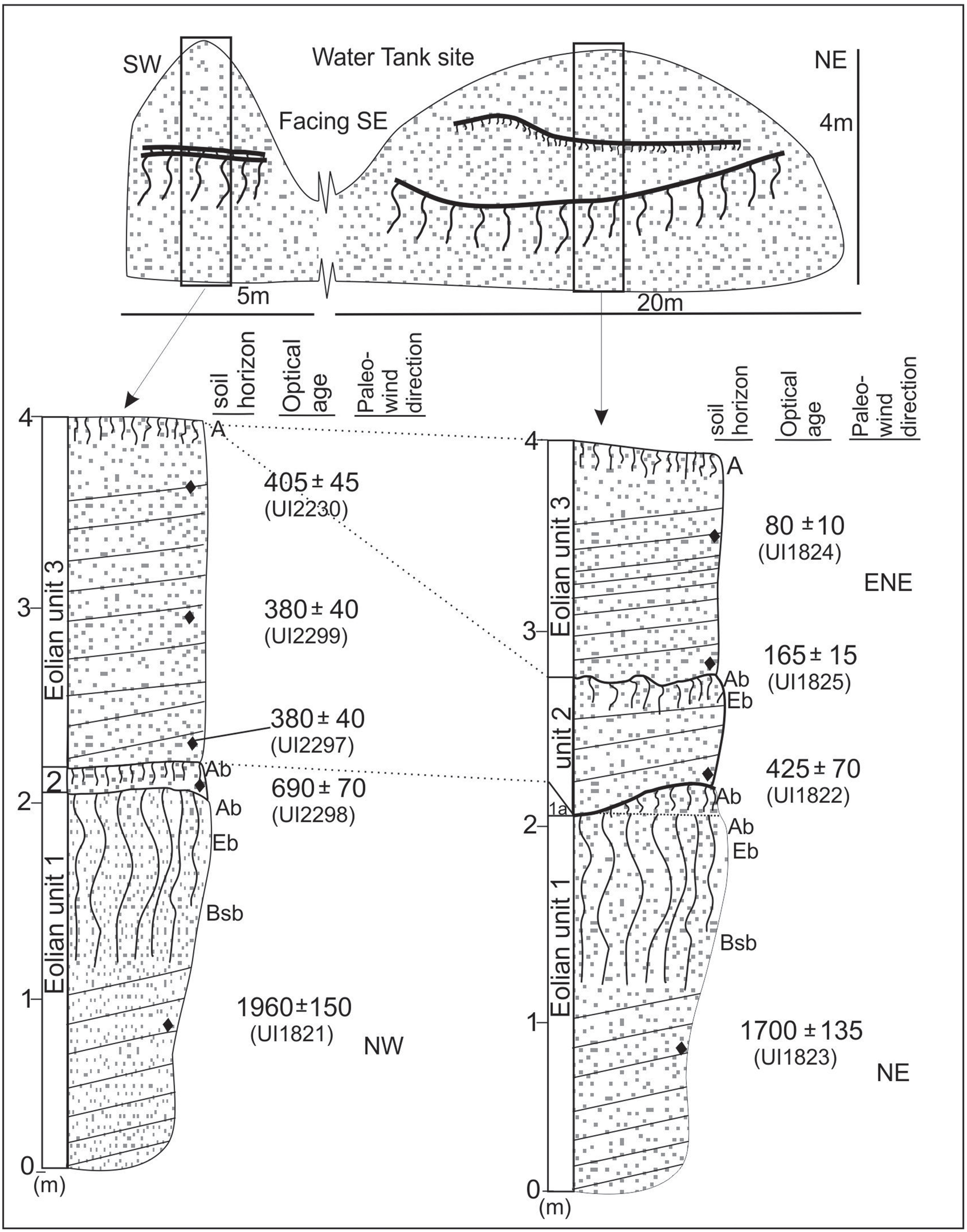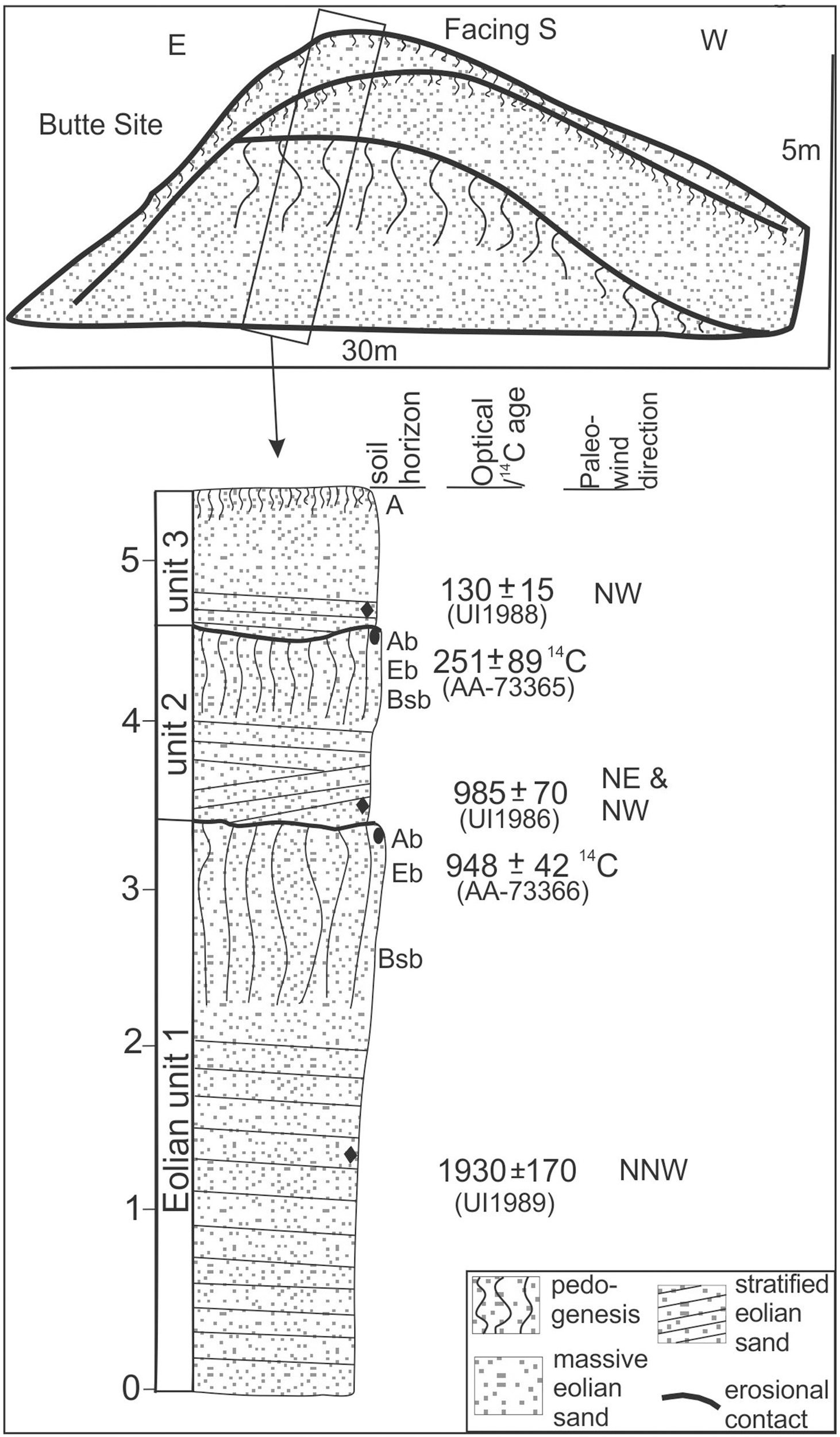 Stratigraphy, buried soils, paleowind directions and associated 14C and OSL ages for the Butte site, Cape Cod National Sea Shore, Massachusetts. The datum year for all ages is AD 2000.