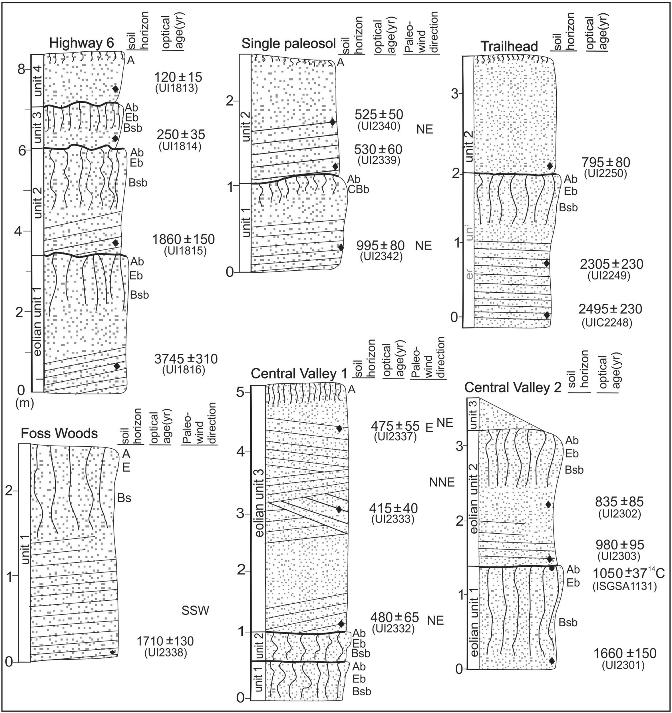 Sections were studied with attention to sedimentologic and pedogenic details. The attitude of beds was recorded to assess paleowind directions. These measurements are most meaningful where bed dips are >5°. Paleo-wind directions may be variable when inferred from stoss side, avalanche beds as a dune advances over complex topography; derived wind directions may be at the quadrant scale. The variability in bed thickness, nature of bed contacts and the associated granulometry was recorded. Attention was focused on bedding planes and unit contacts to assess if there were hiatuses in deposition, sometimes indicated by the presence of a buried soil or localized bioturbation. The recognition and lateral tracing of a buried soil is pivotal because this stratigraphic marker reflects probably landscape stability, associated with relatively mesic conditions. We used well vetted soil stratigraphic and geomorphic approaches (e.g., Birkeland, 1999; Tripaldi and Forman, 2007). All soil colors were assessed in the dry state. Eolian stratigraphic units representing discrete depositional events were defined by either bounding buried soils or sedimentologic characteristics.