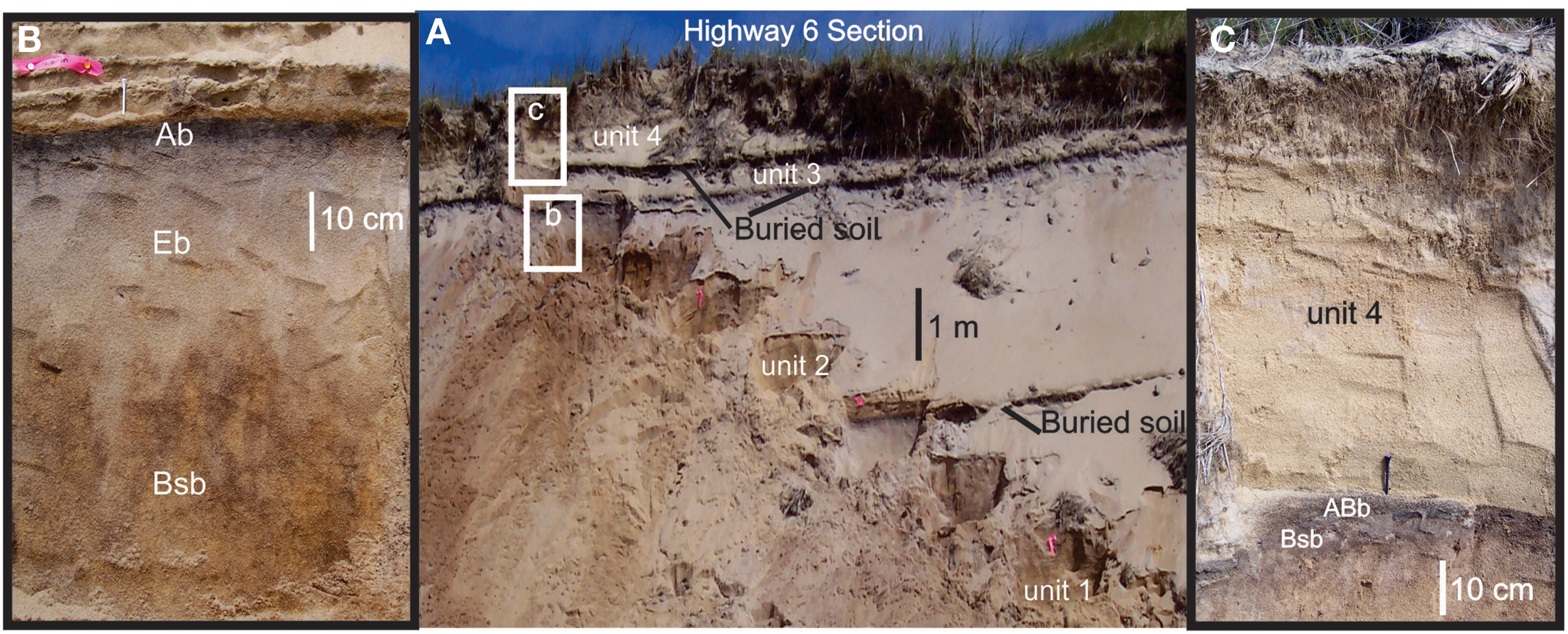 Stratigraphic, sedimentologic, and pedologic observations are presented for seven sections in the informally named Cape Cod dune field (cf. Forman et al., 2008). These sequences are characterized by depositional units of eolian sand with paleosol (s) often developed in the subjacent sediment. Usually, eolian stratigraphic successions contain a conservative record of depositional periods and associated hiatuses because of the unknown completeness associated with erosion and pedogenesis (cf. Tripaldi and Forman, 2007). Thus, multiple sections were studied in this dune field located in different depositional and geomorphic contexts, which collectively may reflect the complex history of eolian deposition, landscape stability, and inferred environmental changes. At many localities tens to hundreds of meters of section are laterally exposed confirming the continuity of stratigraphic units. The Foss Woods site is beyond the area of active dune migration where dunes are vegetated and stabilized; and reflects a period of broader eolian activity. The Highway 6 and Water Tank sections expose strata through the limbs of high parabolic dunes, which accrete vertically with eolian activity and should preserve paleosols. The Trail Head, Central Valley and Single Paleosol sections are in topographically low sites and in the interior blow-out areas of the dune field. The Butte site is an erosional remnant near the margin of the dune field.