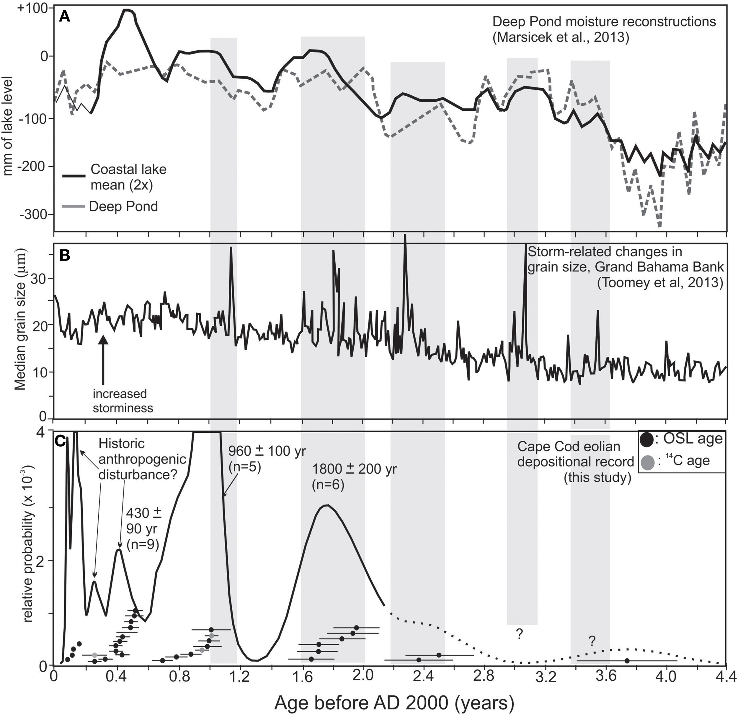 Another factor that may influence eolian activity is periodic drought as documented by tree-ring time series that span the past 2000 years (e.g., Cook et al., 2014). However, drought in a mesic environment with an average precipitation of ~1000 mm/year may result in ecologic stress and a change in species composition (Parshall et al., 2003), but not usually broad-scale landscape denudation. Dry conditions in the Northeastern US may be associated with increased forest fire (Parshall et al., 2003; Clifford and Booth, 2013) and such an ecological disturbance may lead to local landscape degradation. Drought conditions on Cape Cod, particularly associated with forest fires may be a contributory factor for increased eolian activity.