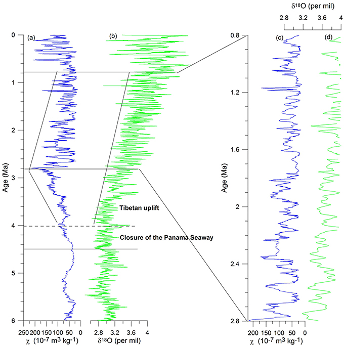 Correlation between the χ record and the benthic oxygen isotope record during the last 6 Myr also reveals other important paleoclimatic information. We found a good correlation between the χ record and the benthic oxygen isotope record during the last 6 Myr except for the interval between 4.5–2.7 Ma (Figure 6). For this interval, χ is higher when the benthic oxygen isotope ratio is higher. We have attributed this lack of correlation between these two records during this interval to closure of the Panama Seaway and/or uplift of the Tibetan Plateau (Nie et al., 2008a,b, 2014b). Model simulations support that either factor can increase rainfall on the CLP and thereby overcome decreases in rainfall caused by increased ice volume and colder climate (An et al., 2001; Motoi and Chan, 2010). However, which factors are more important needs to be studied further.