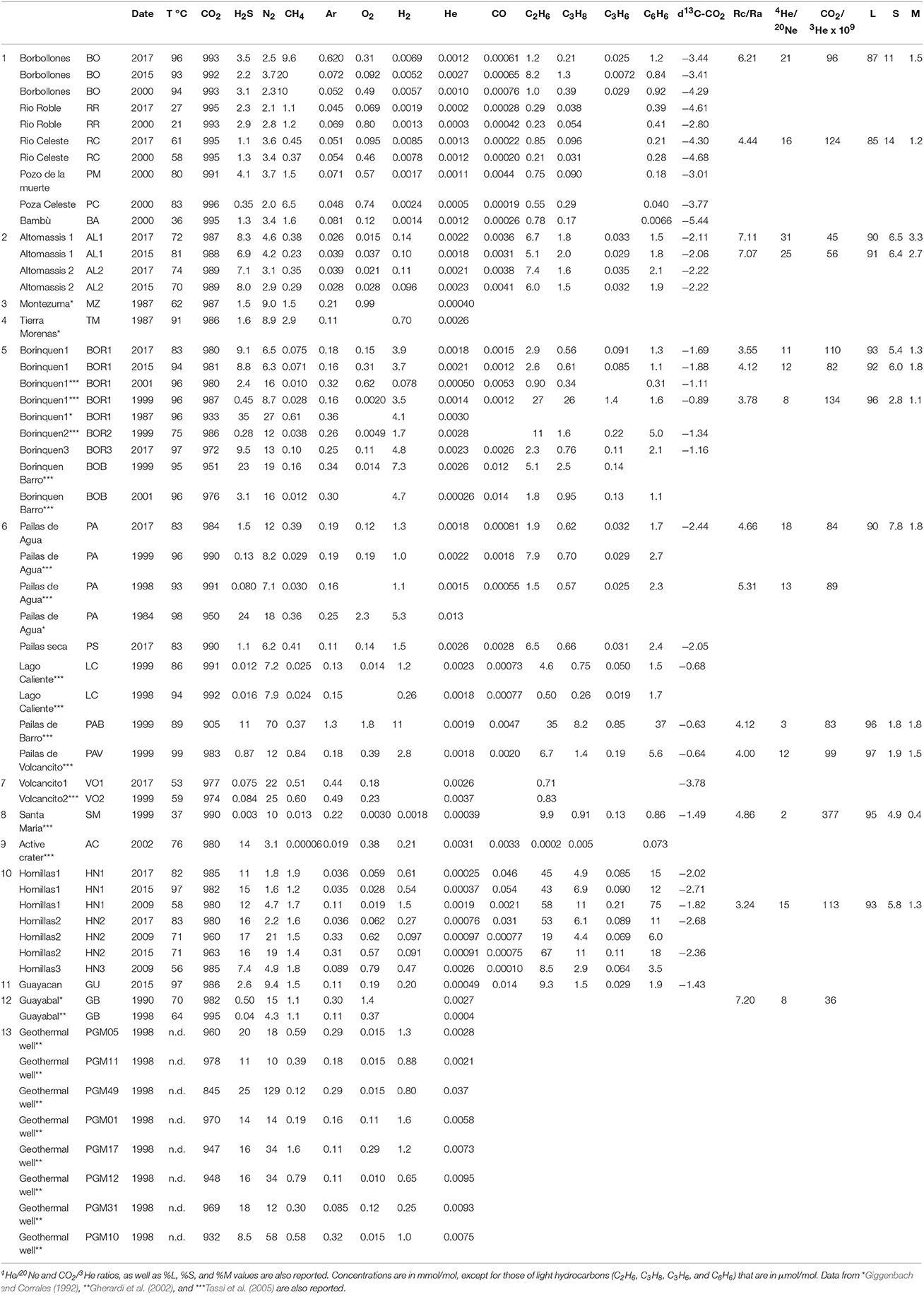 Gases were collected during 4 campaigns (April 2000, March 2005, February 2009, and February 2017) from thermal manifestations located in the surroundings of Rincón de la Vieja, Miravalles, and Tenorio volcanoes (Figure 1).