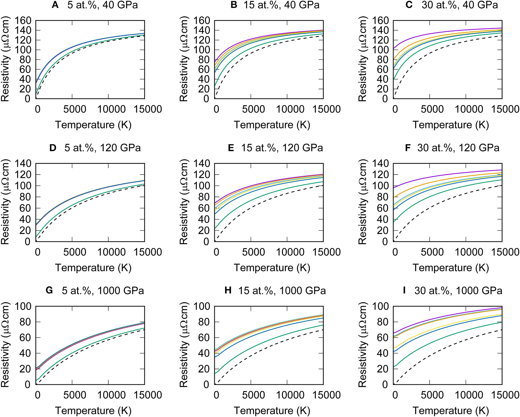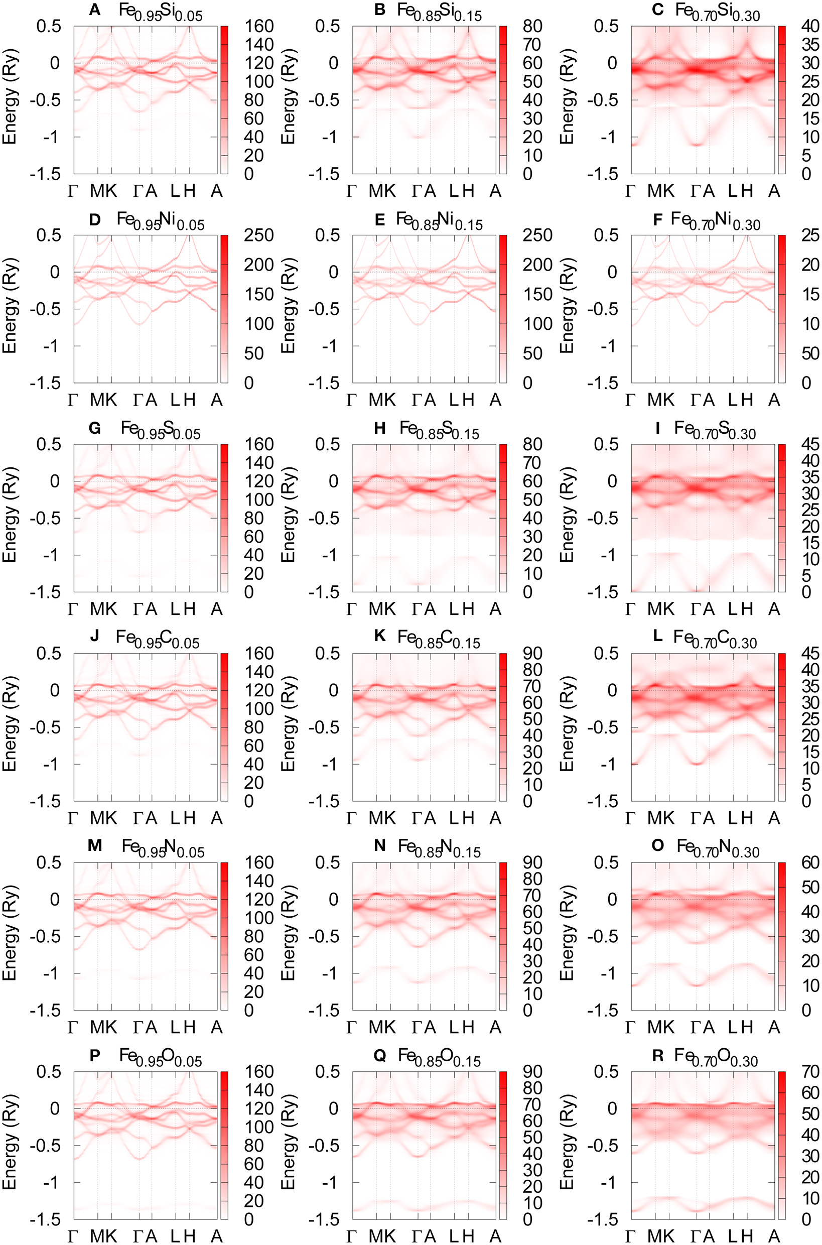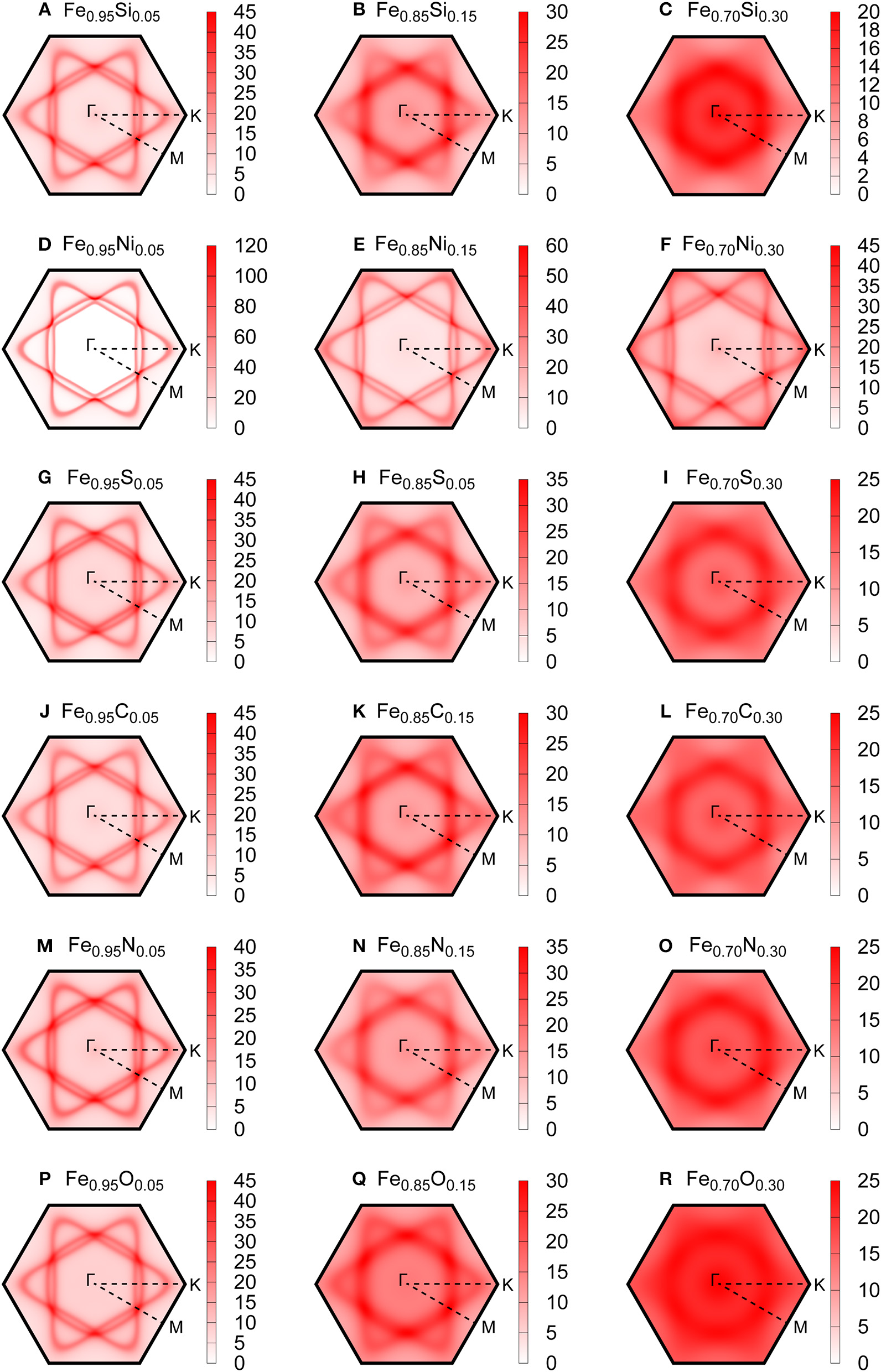 In the previous section, we discussed dilute alloys, however, the Earth's core should have a large amount of impurity elements (e.g., Hirose et al., 2013). Gomi et al. (2016) reported the resistivity calculation of Fe-Si and Fe-Ni alloys by using the KKR-CPA method, as well as DAC experiments of Fe-Si alloys. Here, we show the systematic survey of impurity resistivity of light element candidates (C, N, O, Si, and S) and Ni in Fe-based high concentration alloys at zero Kelvin (Figure 3 and Table 1). Basically, impurity resistivity of light element candidates is larger than Ni, which agree with dilute alloy results. This can qualitatively be understood in terms of the broadening of energy dispersion via the uncertainty relationship between energy and time; ΔEΔt ≥ ℏ/2, where ΔE is the uncertainty in energy, Δt is electron life time, and ℏ is the reduced Planck's constant (the Dirac's constant) (Gomi et al., 2016). Figure 4 shows the Bloch spectral function along with the path, which connects the high symmetry points in the Brillouin zone of the hexagonal lattice. If there is no scattering, the Bloch spectral function is equivalent to the band structure of perfectly ordered crystal. Indeed, the broadening features of Fe-Ni alloys are weaker than that of other Fe-light elements alloys. At 19.10 Å3 (~40 GPa), Si shows the largest impurity resistivity, followed by C, S, and N. The smallest impurity resistivity is obtained from O impurity among the light element candidates. Note that this sequential order is completely different from that of dilute alloys (Figure 1).