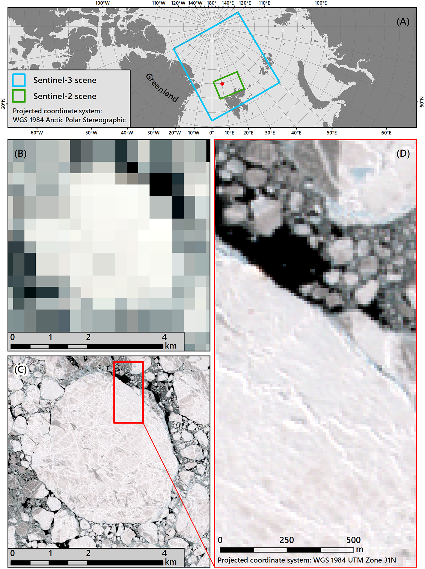 Comparison of Sentinel-2A (S-2A) and−3A (S-3A) spatial coverage and resolution [contains modified Copernicus Sentinel data (2017) processed by ESA/EOM]. (A) Coverage of S-3A/OLCI and S-2A/MSI scenes, the red dot indicates the location of (B). (B) Ice floe acquired with S-3A/OLCI (300 m, RGB: 665, 560, and 490 nm) at 2017-06-10 14:00:15 UTC. (C) The same floe acquired with S-2A (10 m, RGB: 665, 560, and 490 nm) at 2017-06-10 14:58:01 UTC. (D) S-2A details.