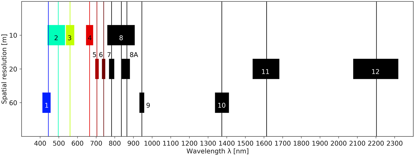 ESA's Sentinel-2 mission (S-2) offers new opportunities for optical sensors in the Landsat-like spatial domain. S-2 consists of the twin satellites S-2A and S-2B, launched in 2015 and 2017, respectively. Both satellites are equipped with the MultiSpectral Instrument (MSI), which provides 13 spectral bands with a 12-bit radiometric resolution in the wavelength region from 443 to 2,202 nm. Depending on the band, spatial resolution varies between 10, 20, and 60 m (European Space Agency, 2015, 2018a). Figure 2 illustrates the spatial and spectral settings of S-2A. Compared to L-7, S-2 has a larger swath width (290 km) and geographical coverage reaches up to 83° north. The two S-2 satellites are shifted by 180° on the same orbit, which results in a return period of 5 days. In higher latitudes, overlapping swaths further increase the return period to up to one image per day (European Space Agency, 2015, 2018b; Copernicus EO Support, personal communication). Due to the terrestrial focus of the S-2 mission, geographical coverage in the Arctic Ocean is currently limited to areas around islands but areas of interest may be added to the Mission baseline “if sufficient resources are identified” (European Space Agency, 2015). Malenovský et al. (2012) mentioned the potential of S-2 for albedo retrieval, derivation of snow properties and mapping of polynyas and leads; nevertheless, they also highlighted the demand for “precise corrections for atmospheric propagation, topography and directional reflectance behavior” (Malenovský et al., 2012), pointing to the importance of atmospheric correction (AC) of optical remote sensing data. Zege et al. (2015) also emphasized the importance of AC for the retrieval of melt pond fraction and surface albedo.