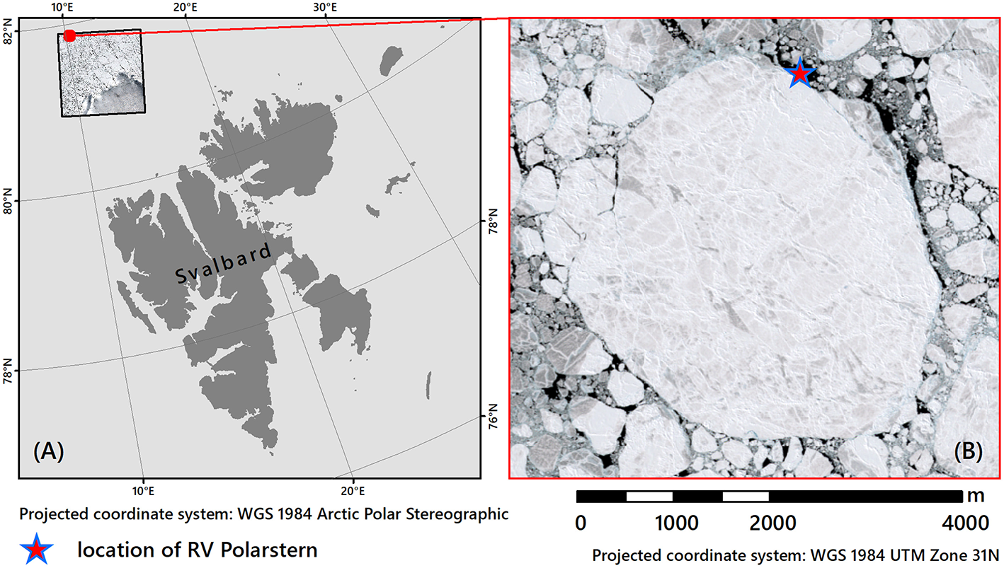 Location of S-2 granule (A) and ice floe (B) in the Arctic Ocean on June 10, 2017.