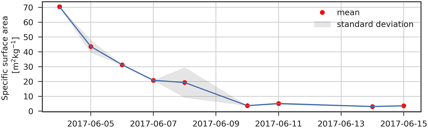 During cruise PS106.1 RV Polarstern was moored to an ice floe north of Svalbard between June 3 and 16, 2017 (Figure 3). At the beginning of the measurement period, snow and white ice covered most of the floe. Some few ponds had already formed at pressure ridges but we did not observe any pond formation on the flat parts of the floe; bare ice was exposed only very occasionally. Neither ponds nor bare ice were present near the measurement sites. Melting, however, started during the measurement period. The specific surface area of snow samples from the top 1–2 cm has been analyzed with an IceCube (A2 Photonic Sensors, France) at different locations in the area of interest. Snow melt results in a decrease of the snow's specific surface area. Figure 4 illustrates that melt occurred between June 4 and 10.