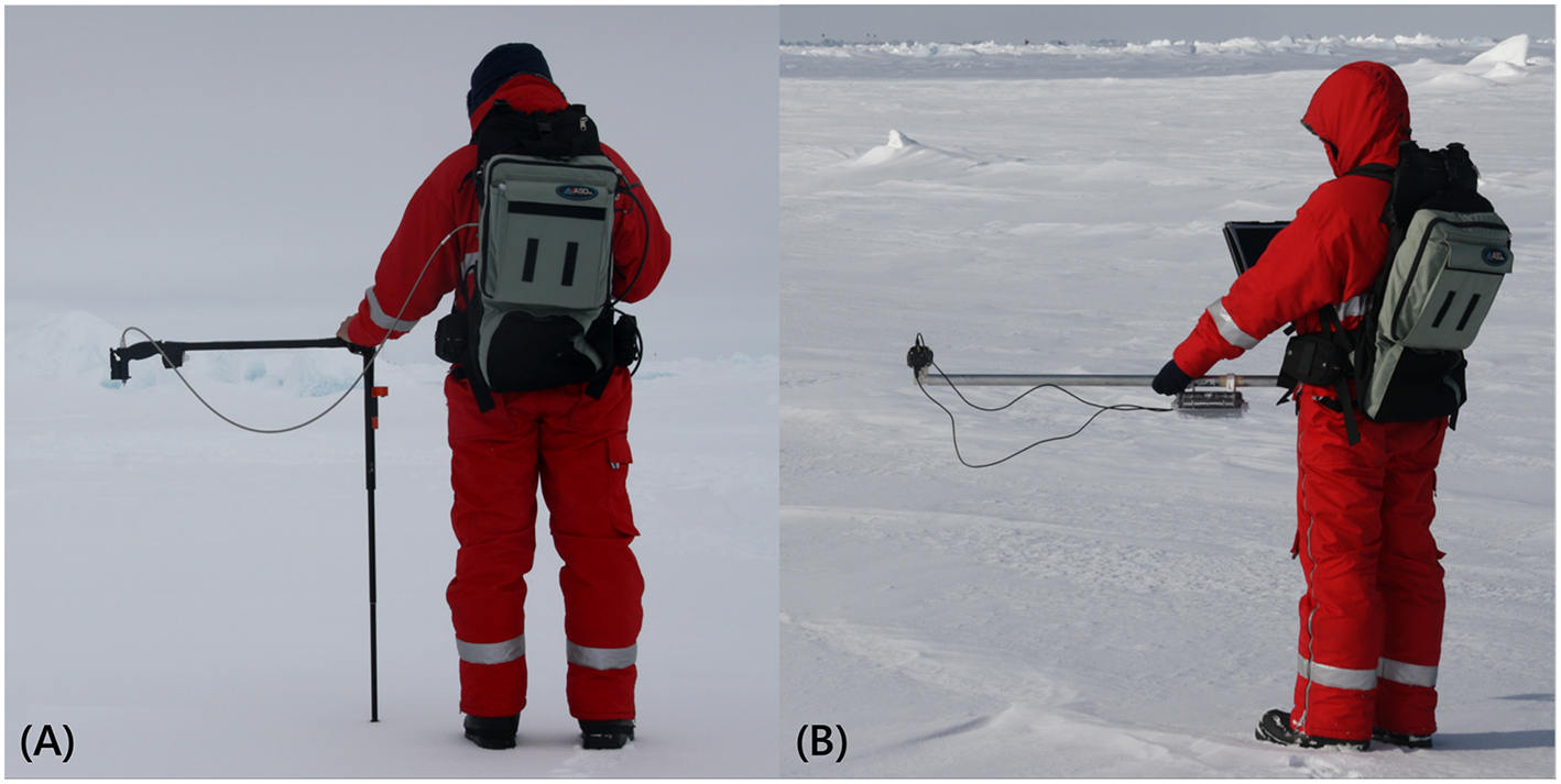For spectral measurements on the floe, we used an ASD LabSpec5000 spectrometer (Analytical Spectral Devices Inc., United States), covering the wavelength region from 350 to 2,500 nm with a 1 nm spectral sampling rate. The ASD was equipped with an optical fiber with a 23° field of view (FOV) mounted to a pistol grip attached to a pole to avoid influences of the polar suits during the measurements (Figure 5A). We used a Labsphere Spectralon reflectance standard with 95% diffuse reflectance (Labsphere Inc., United States) as white reference. In addition, we used a set of Ocean Optics STS-VIS spectrometers (Ocean Optics Inc., United States). The setup consists of two synchronized spectrometers; one pointing downwards with a 1° FOV and the other, equipped with a diffusor, pointing upwards to track planar incoming radiation. Both instruments cover a wavelength region from 340 to 820 nm with a spectral sampling rate <1 nm. The spectrometers have also been attached to the end of a pole to avoid influences of the polar suits on the measurements (Figure 5B). For the Ocean Optics Instruments, we used a Labsphere Spectralon 99% diffuse reflectance standard (Labsphere Inc., United States) as white reference. For both instrument setups, we took reference measurements at intervals <10 min and when illumination conditions changed. Before conducting a white reference measurement with the ASD, we measured the Spectralon panel to control whether illumination has changed since the last reference measurement. If we detected changes, we performed a visual quality check on all measurements since the previous white reference and deleted spectra with unusual shapes. We corrected the Ocean Optics measurements for irradiance changes using the upwards pointing sensor. To account for the spatial heterogeneity within one S-2 pixel, we either walked around during the measurement process or performed measurements at different sites that we chose randomly. Table 2 summarizes measurement dates, instruments and illumination conditions.