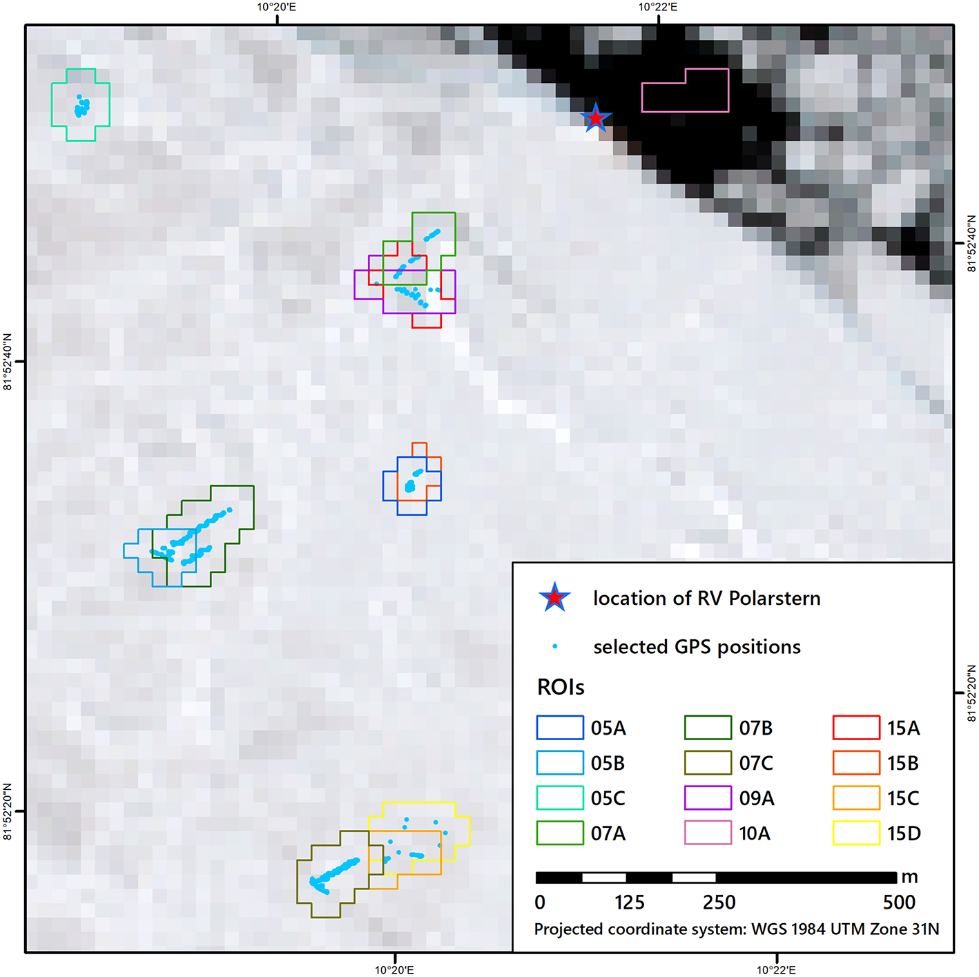 In general, a point-by-pixel comparison is necessary for an accurate validation of remote sensing data via in situ measurements. With a steadily drifting floe, however, we are unable to assess precise accuracies of GPS measurements and trilateration; we therefore dismissed a point-based validation. Instead, we defined a region of interest (ROI) for each measurement Section by computing a circular buffer with a 20 m radius around all GPS points belonging to one measurement section. We defined all pixels intersecting the respective buffer area to be one ROI. Table 3 lists the respective number of pixels and field spectra as well as the measurement device used for each ROI.