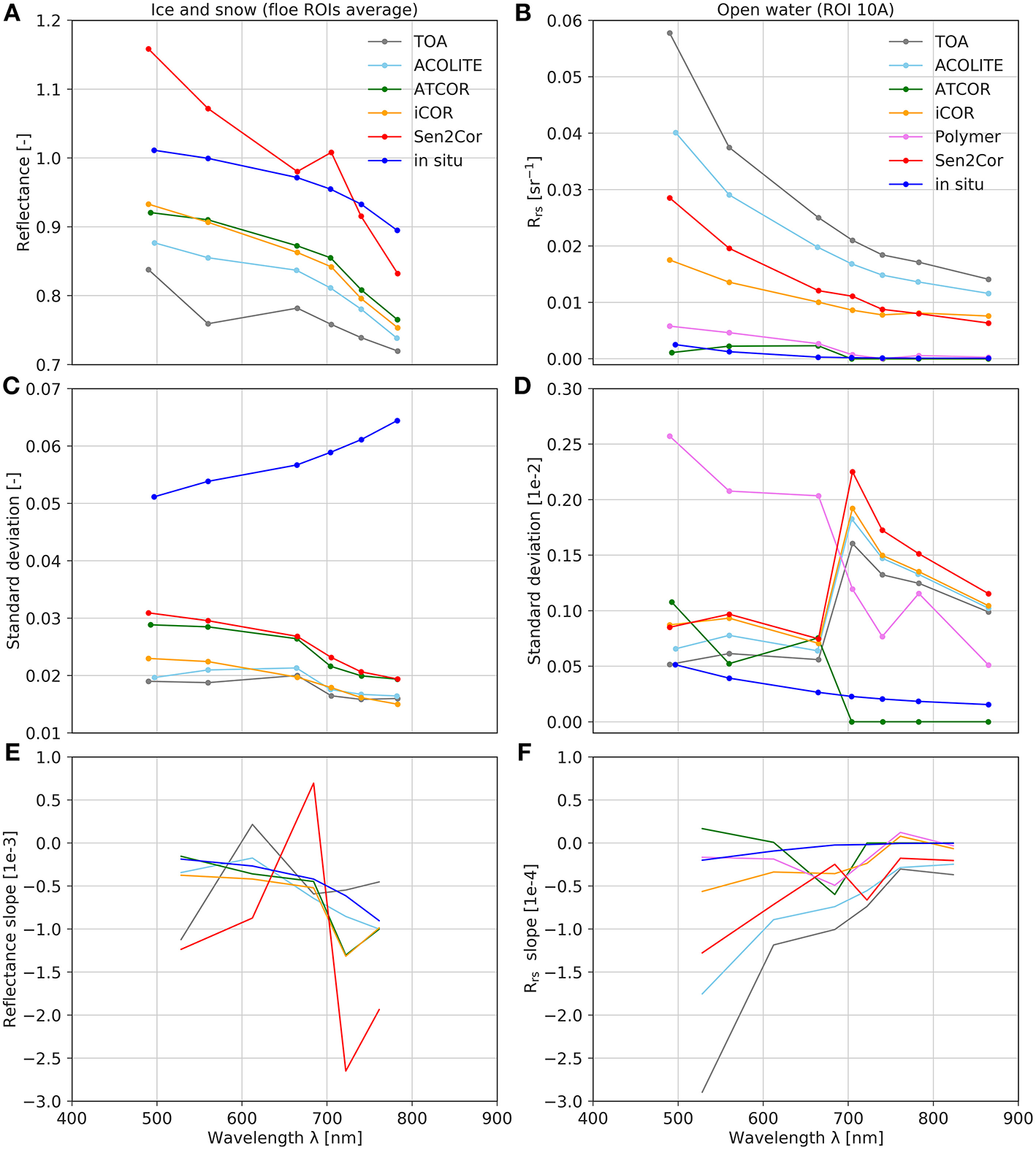 We performed the spectral measurements on the floe within 5 days before and after the satellite acquisition. Illumination conditions therefore differed for field measurements and the satellite observation (see section Radiometric Measurements) which may affect measurement results (Malinka et al., 2016). Moreover, due to the different spectrometer setups described in section Snow and Ice Measurements on the Floe, ASD and Ocean Optics show varying sensitivities to changing illumination conditions. The different FOVs result in varying sensitivities to changing sensor-surface geometries. An inter-comparison of ASD and Ocean Optics under field conditions revealed mean differences in surface reflectance of about 0.1; a comparison of in situ spectra and BOA reflectances by means of classic performance metrics such as bias or root mean squared error therefore is unreasonable.