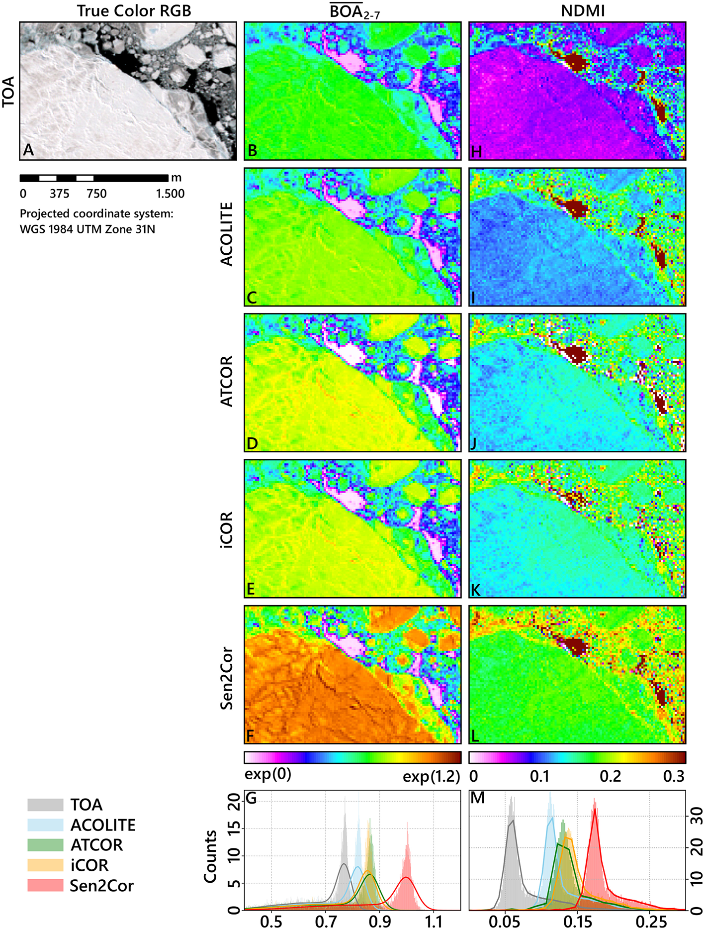 Radiative transfer through the atmosphere is strongly influenced by Rayleigh and Mie scattering as well as aerosol and gas absorption. This combination is particularly challenging over water areas, where the atmospheric path radiance is typically >85% of the total signal in oceanic waters, >60% in sediment-rich waters, and >94% in very dark waters (IOCCG, 2010). Low sun-zenith angles (>70°) and correspondingly long atmospheric paths further aggravate the processing of data at the beginning and the end of summer in high latitudes (IOCCG, 2015). An adequate AC is therefore essential for the derivation of physical surface properties and follow-up multi-temporal analyses. Another challenge resulting from atmospheric transfer and the scattering of radiation is the neighboring or adjacency effect, i.e., the scattering of light from neighboring surfaces into the sensors field of view resulting in information overlay (Sterckx et al., 2015b). Adjacency effects depend on the brightness contrast between a target pixel and its neighborhood (Richter et al., 2006). The Arctic sea ice is a mix of snow, ice, melt ponds and ocean water, with typical broadband albedos in the visible wavelength region (VIS) ranging from >0.90 for fresh snow to <0.05–0.1 for ocean water (Perovich et al., 1998). Moreover, while being negligible for wavelength regions >1.5 μm, the adjacency effect increases with shorter wavelengths (Richter and Schläpfer, 2017), i.e., the wavelength region used for water remote sensing is heavily affected. Due to the characteristic spatial mixture and high contrasts of deep, clear ocean waters, melt ponds, bright ice and snow surfaces in the sea ice, we expect the adjacency effect to have a large impact on S-2 imagery of Arctic sea ice.