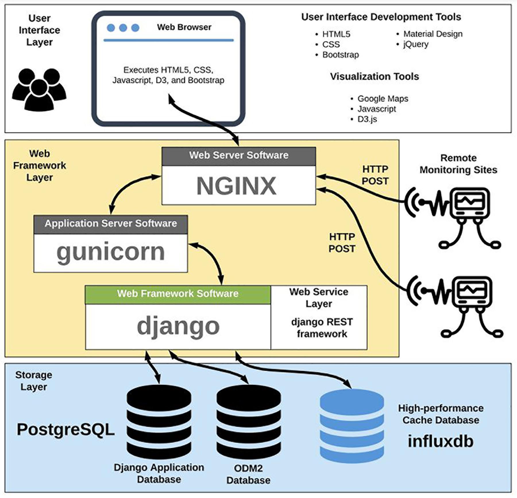 The ODM2 Data Sharing Portal was designed as a web application with a web browser-based GUI. The overall Architecture of the software consists of a user interface layer, a web framework layer, a web service layer, and a data storage layer (Figure 1). In the following sections, we describe the high-level design of each of the architectural layers, their key components, and their basic functionality. In Section “Results” we describe a specific implementation of the ODM2 Data Sharing Portal for the Monitor My Watershed network of water quality monitoring sites, each of which uses an Arduino-based EnviroDIY Mayfly datalogger. Finally, in the “Discussion and Conclusions” section we discuss the capabilities of the system, some of the challenges we faced in our implementation, and how they were overcome.