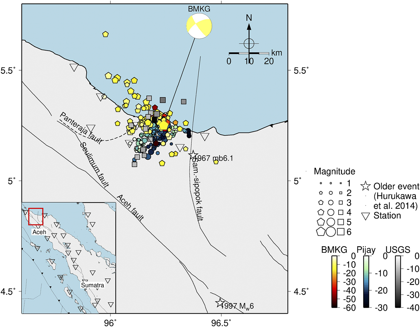 Mainshock and aftershocks (BMKG, Pijay, and USGS network) of the Pidie Jaya 2016 earthquake. Focal mechanism (mainshock) is from BMKG. The relocated BMKG aftershocks (December 7–19, 2016) from Supendi et al. (2017) are plotted with a yellow pentagon. Relocated Pijay aftershocks (December 14, 2016–January 15, 2017) from Muzli et al. (2018) are plotted with blue circle. USGS aftershocks (December 6–17, 2016) are plotted with a gray square. The relocated Pijay network aftershocks are creating planar fault that dips 63° toward southeast (Muzli et al., 2018); white stars are relocated past events from Hurukawa et al. (2014). Samalanga-Sipopok Fault is taken from Barber et al. (2005). Panteraja Fault is taken from Muzli et al. (2018). Seulimum and Aceh Faults are taken from the National Center for Earthquake Studies of Indonesia (PUSGEN). The figure was modified from Kusumawati et al. (2019b) and Sahara et al. (2019).