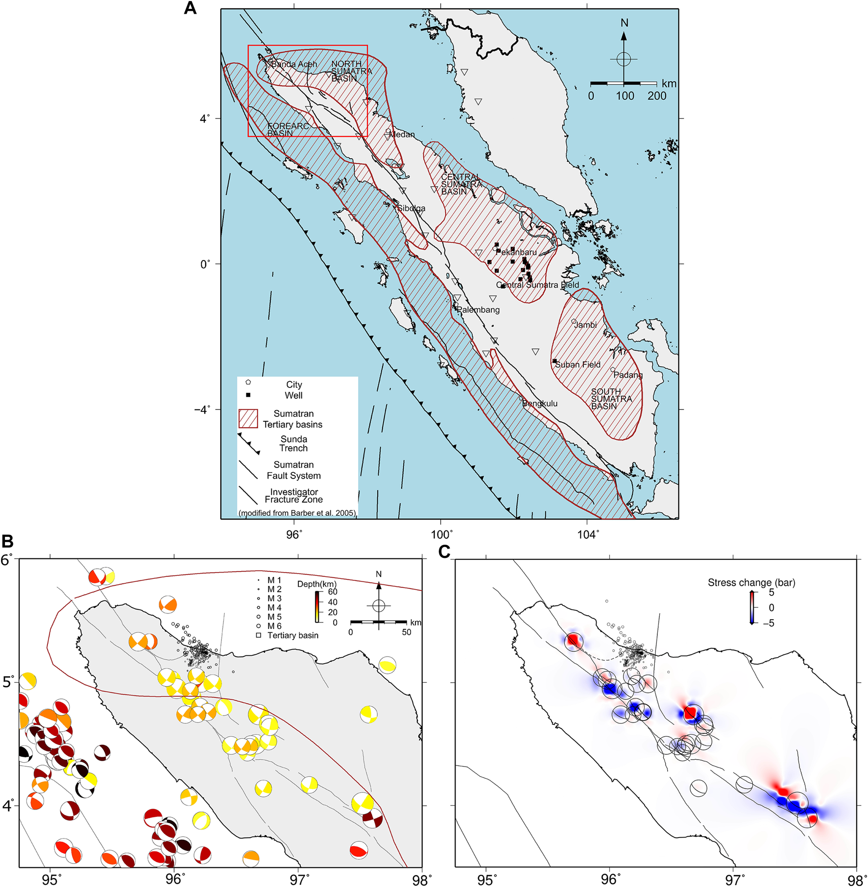 The Pidie Jaya earthquake occurred in the back-arc basin of the northern part of Sumatra Island. Due to lack of local SH information about this area, we inferred the SH orientation from the nearest basin, that is, from the central Sumatra Basin, to be N39°E ± 3.9° (Mount and Suppe, 1992). In this calculation, we considered the uncertainty range (±3.9°) to cover the possibility of SH which may be less than N39°E in our study area. We inferred the stress magnitude from the in situ stress measurement in the Suban field, South Sumatra, i.e., SH 340 bar/km, Sv 240 bar/km, and Sh 180 bar/km (Hennings et al., 2012).