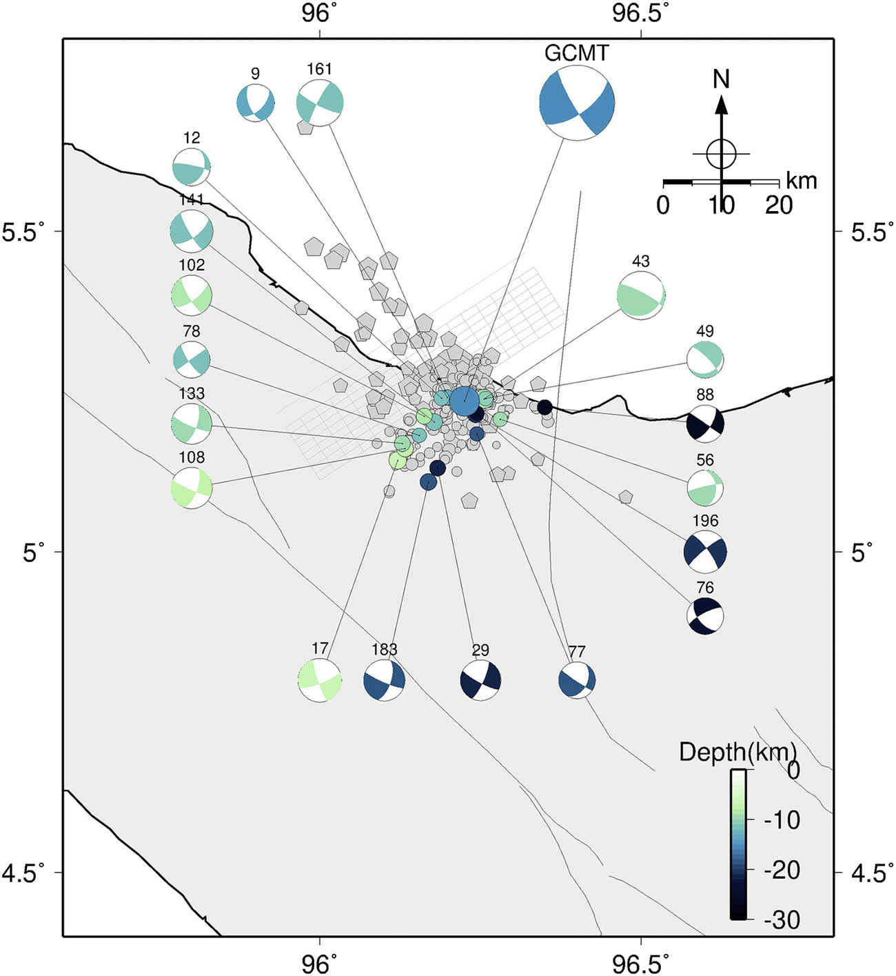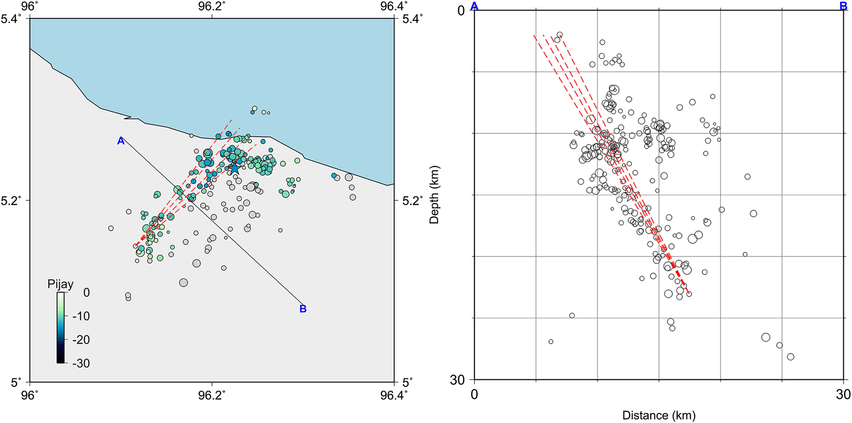 The Pidie Jaya earthquake struck the Pidie Jaya district in Aceh, Indonesia, on December 7, 2016, at 05:03:33 local time. It was followed by aftershocks which were detected up to one month after the event. Regional and local networks in Indonesia recorded these aftershocks (Supendi et al., 2017; Muzli et al., 2018). The regional stations of the Agency for Meteorology, Climatology and Geophysics (BMKG) recorded large aftershocks, while the Pijay-Net temporary local stations, deployed jointly by BMKG, German Research Center for Geosciences (GFZ-Potsdam), Institut Teknologi Bandung (ITB), and Syiah Kuala University (UNSYIAH), also recorded aftershocks including those having small magnitudes. Moreover, global networks, such as the United States Geological Survey (USGS) seismic stations, also detected some aftershocks. However, the aftershocks from these three catalogs show an ambiguous fault plane orientation, as depicted in Figure 1.