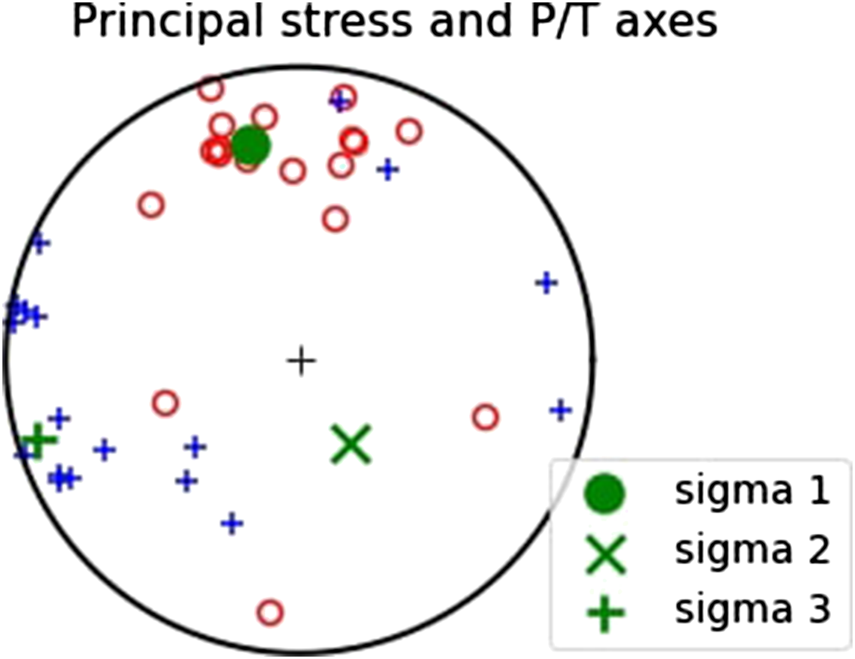 The focal mechanisms of the Pidie Jaya aftershocks might provide additional focal mechanism data for this area. Revisiting the possibility of inverting stress orientation from focal mechanism data, we plotted the P/T axes of the focal mechanism of the Pidie Jaya aftershocks in Figure 6, using STRESSINVERSE code (Vavryčuk, 2014). The P/T axes of the focal mechanisms could show the direction of maximum and minimum principal stress direction acting on the focal mechanism. From Figure 6, we can see that most of the aftershocks create a convergent cluster of principal stress axes; however, some points deviate, which is shown by red open circles in the lower half-circle and blue positive signs in the left half-circle. This deviation might show slight variation in the direction of local stress acting on the focal mechanisms. The azimuth of (average) maximum principal stress or sigma 1 is oriented approximately NNW, as shown by the green dot in Figure 6. The orientation of maximum principal stress could represent the SH direction. However, in this case, inverting stress orientation from aftershock data might represent the local stress orientation as the result of the mainshock stress perturbation. Thus, we did not invert the regional stress orientation from the focal mechanism of the Pidie Jaya aftershocks.