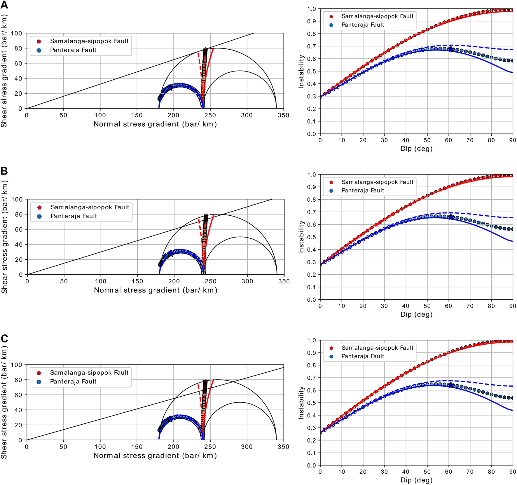 Instability results with constant strike values 43.6° for Panteraja and 180° for Samalanga-Sipopok Faults. Dip values were varied from 0° to 90°. The coefficient friction (μ) is 0.32 for (A), 0.30 for (B), and 0.28 for (C). The right pane is instability vs. dip values and the left pane is the Mohr diagram. Regional maximum horizontal stress orientation is N39° ± 3.9°E; N35.1°E for the dashed line, and N42.9°E for the solid line, but N39°E for the pentagon and circle line. Star shows Panteraja Fault with strike 43.6° and dip 61.2°.