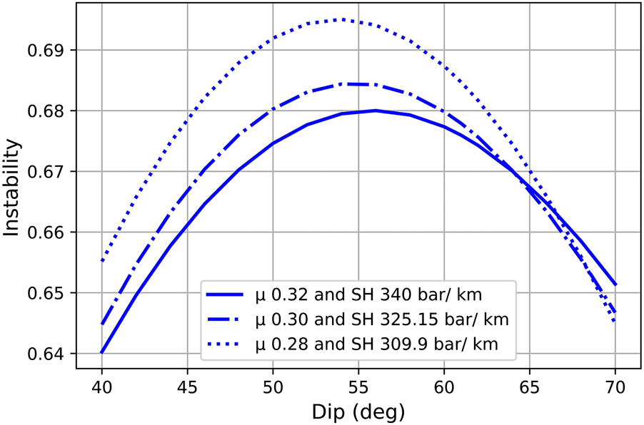 Instability, as shown in Figure 7, is plotted with varying friction coefficients but constant SH values. Hence, the Mohr circle is intersected at two points with the failure line. In real conditions, the Mohr circle will decrease and become tangent only to the failure line at one point. Therefore, we again calculated the instability of the Panteraja Fault with a smaller SH magnitude, utilizing Eq. 9:where ѱ is the arcus tangent of the friction coefficient, which we varied into 0.32, 0.30, and 0.28. We found that decreases in SH magnitude will cause a slight increase in the peak of instability curve of the Panteraja Fault, as shown in Figure 8.