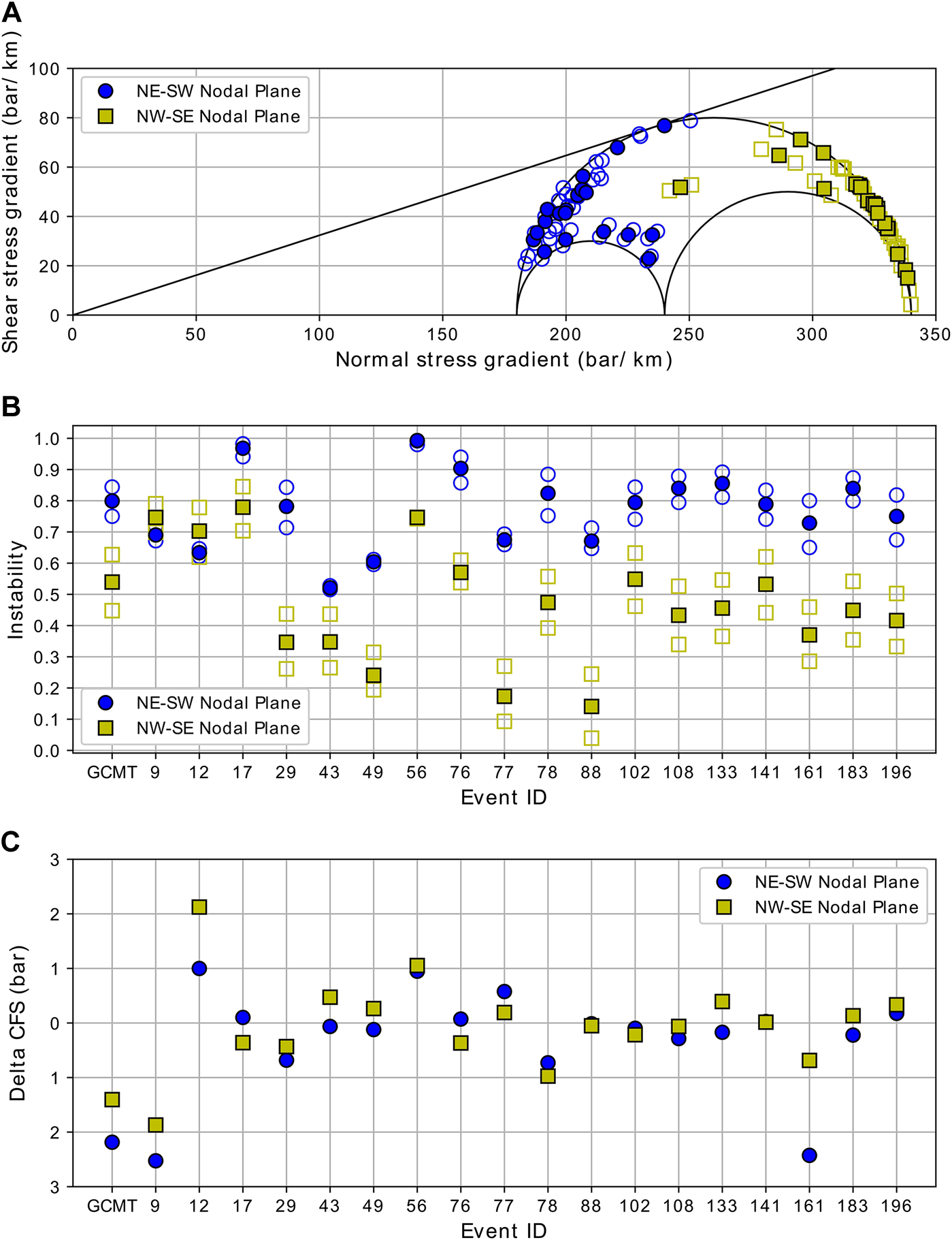 Instability of NE-SW and NW-SE aftershock focal mechanism nodal planes plotted in Mohr diagram (A) and in a graph of instability vs. event number (B). The ΔCFS of 2016 Pidie Jaya mainshock resolved in the NE-SW and NW-SE aftershock focal mechanism nodal planes (C). The open blue circle and yellow square in (A) and (B) are instability values calculated using SH N35.1°E and N42.9°E. The others are calculated using SH N39°E.