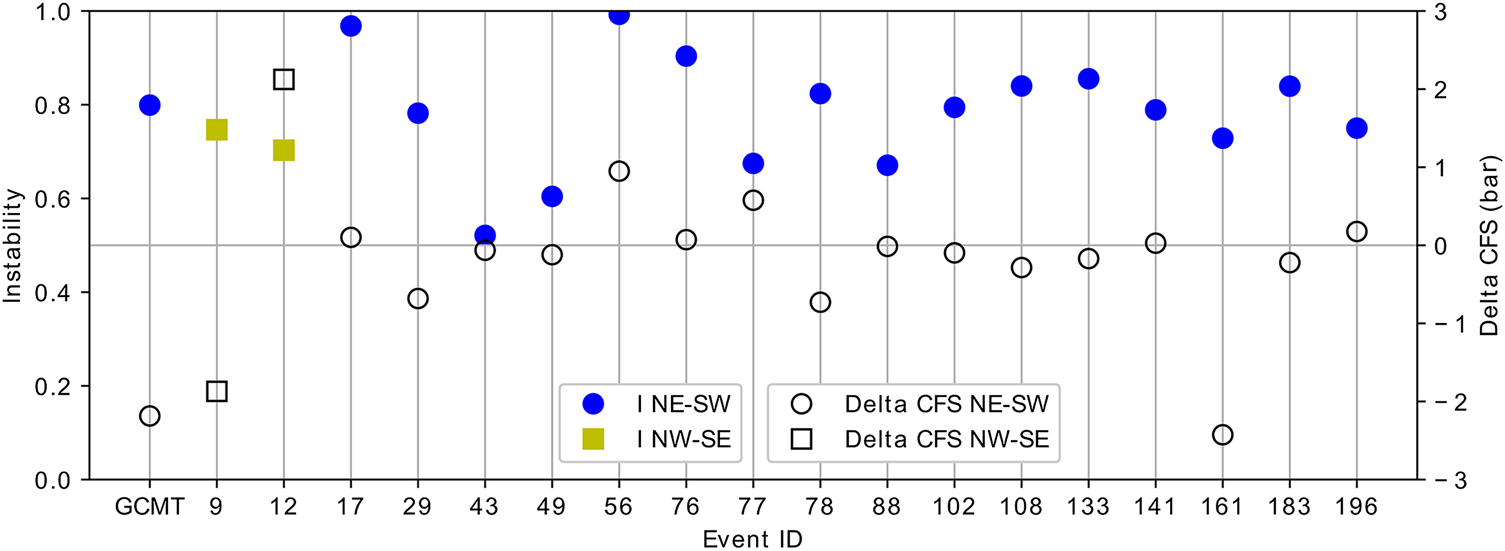 Comparison of instability and ΔCFS of Pidie Jaya aftershocks nodal planes. All events, except events 9 and 12, are plotted using their NE-SW instability and ΔCFS results. Both instability and ΔCFS calculation used a friction coefficient of 0.32.