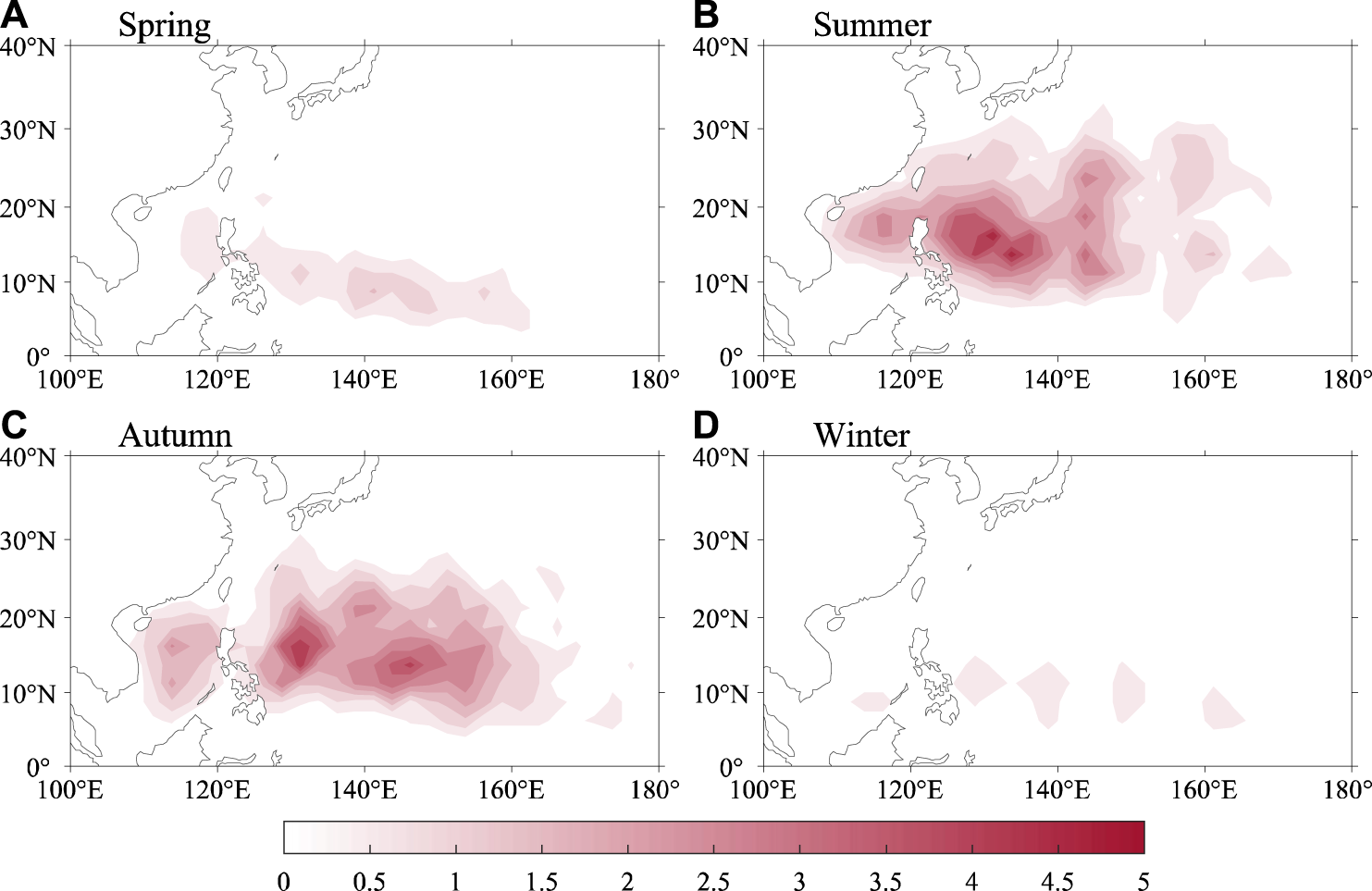 Climatology TC genesis density in four seasons.