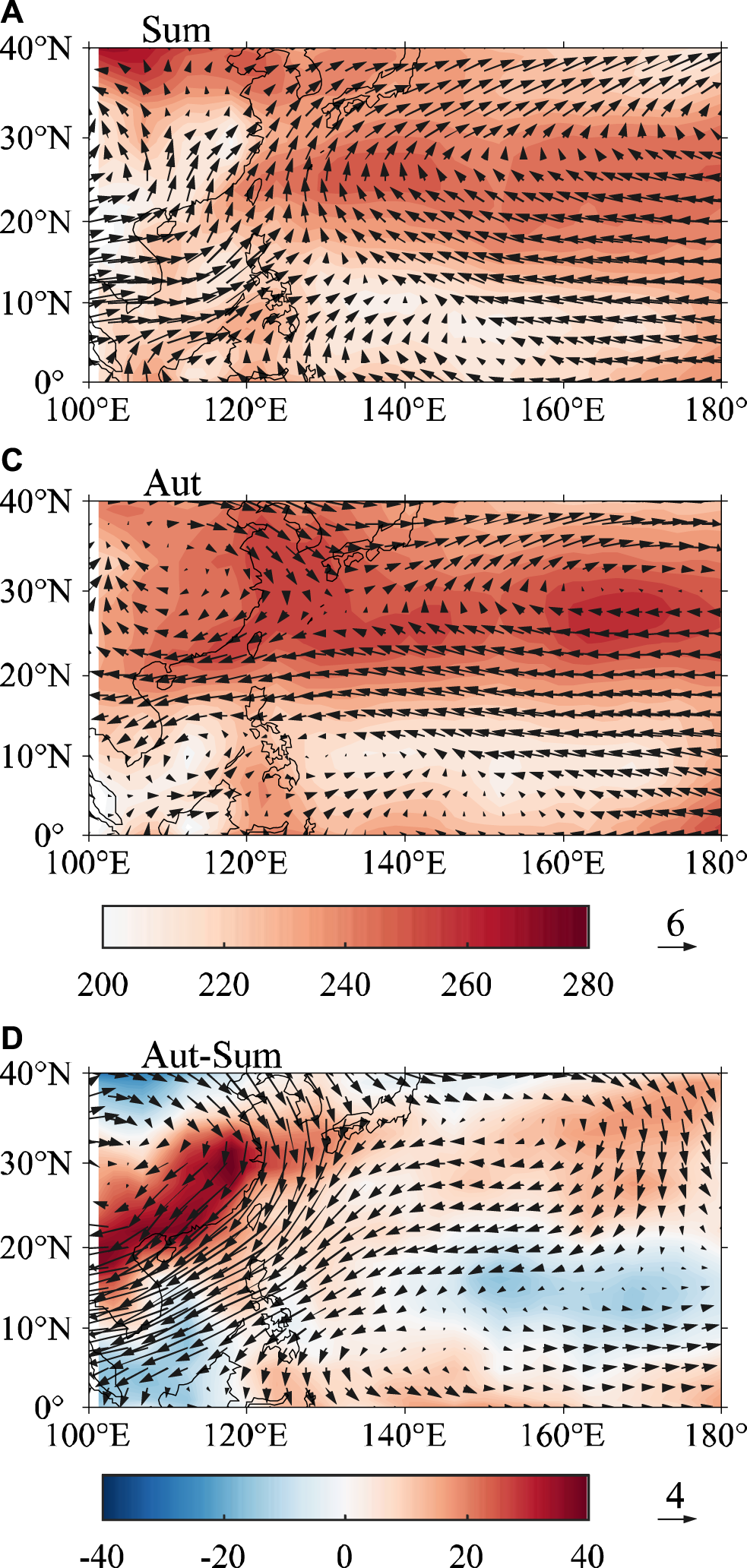 OLR (shaded, W/m2) and 850 hPa wind (vector, m/s) of (A,B) climate state in summer and autumn, respectively, and (C) their difference between two seasons.