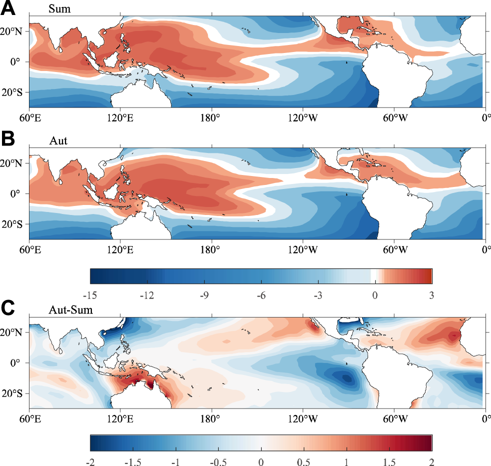SST (shaded, °C) of (A,B) climate state in summer and autumn, respectively, and (C) their difference between two seasons.