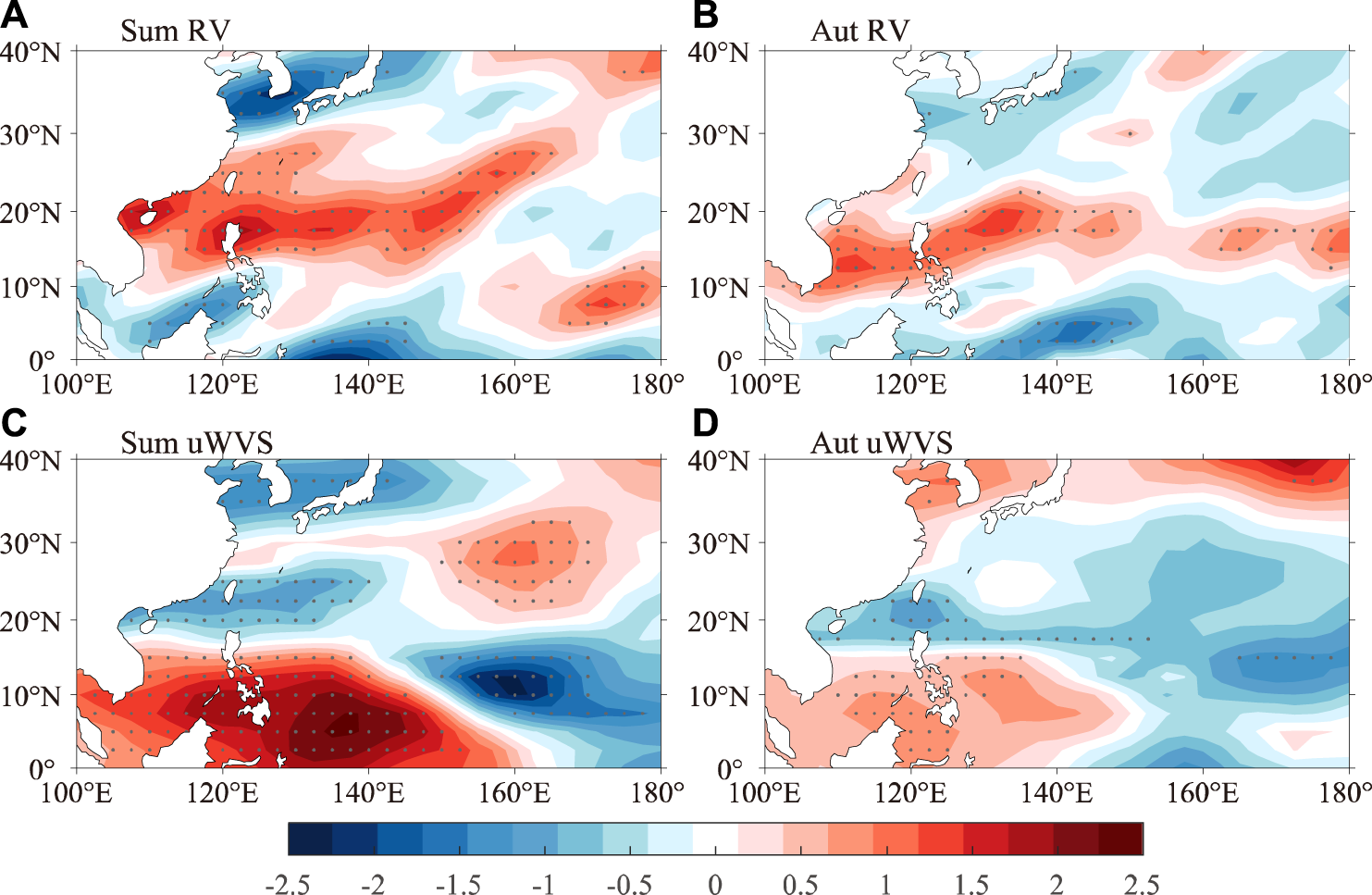 Regression of 850-hPa relative vorticity (10–6 s−1) and vertical u-wind shear (m/s) (A,C) in summer and (B,D) in autumn on the TC genesis frequency. Regression coefficients exceeding 90% confidence level are stippled.