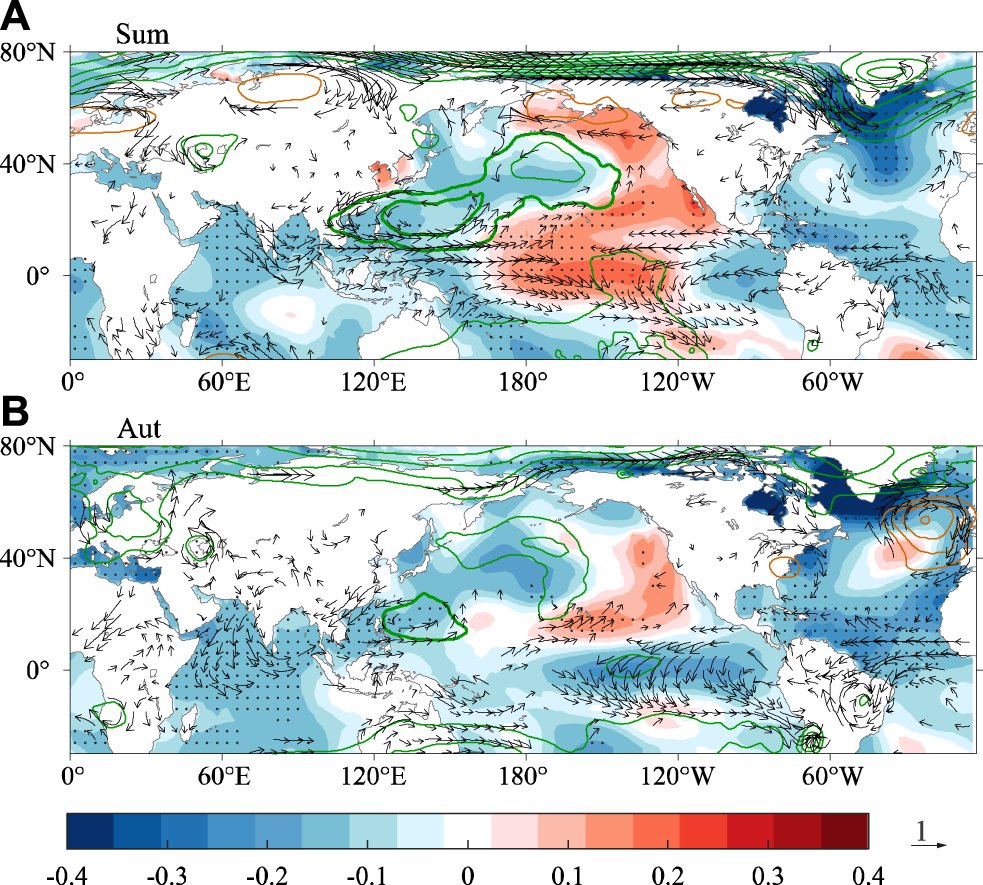But when it comes to the upper troposphere things have changed. Figure 7 indicates the 200-hPa geopotential height, wind field and OLR perturbation. In this level we found that over WNP there are obvious differences of distribution of circulation. There are significant abnormal high-pressure/anticyclonic anomaly over the east Asia/western Pacific sector in autumn, which can enhance the pumping at the upper level (Figure 7B), thus the TC activity is promoted. While in the summer it is controlled by abnormal low pressure and cyclonic circulation (Figure 7A). Lu et al (2019) found that the equatorial north Atlantic SST anomaly (SSTA) can affect the circulation in northeast Asia through the eastward Rossby wave train. Therefore, in combination with the division of both high- and low-level circulation anomalies, the results suggest that the anomalous high-pressure/anticyclonic signals in the upper layer WNP in autumn are probably originated from the SSTA in the Atlantic Ocean. The anomalous low SST in the low-to mid-latitude of the North Atlantic will constrict the air column over the ocean surface. It induces the descending of upper troposphere isobaric surface near the 30°N and forms the corresponding anomalous cyclonic circulation. The anomalous signal propagate to the high latitude brings anomalous high pressure and anticyclonic circulation into being near the high latitude of the Atlantic over 30°W, 50°N. Then the signal continues to propagate in the form of eastward Rossby wave train, forming a low pressure near the 30°E, 50°N with anomalous cyclonic circulation. The wave train then splits into two branches, one of which forms a high pressure center and a cyclonic shear region around 60°E and 30°N and over the northern part of the Indian peninsula, and then the wave signal travels northeast to the region of attention. The other one passes directly through the middle and high latitude to east Asia/western Pacific region, where it cooperates with another wave train to form an abnormal high pressure along with a large range of anticyclonic circulation in situ. The anomalous circulation extends from the land to 150°E, and is matched by the abnormally high OLR distributed on the sea. Moreover, there is an extra high-pressure center near 170°E associated with the tail of wave train, which also leads favorable conditions for TC genesis in eastern WNP. While in summer, SST climate state in the Atlantic is lower than that in autumn (Figure 4C), so when there is a negative SST disturbance, the atmosphere is less sensitive, and it is difficult to form the compression of the air column. Therefore, there is no abnormal cyclone formation and meridional propagation of fluctuation signals in the Atlantic in summer. Combine the distribution form of SST and low-level wind field, the dominant disturbance pattern in summer may be the Pacific Meridional Mode (PMM) in situ (Figure 6A). In order to validate the existence of above Rossby wave train, we analyzed the autumn WAF and RWS. As shown in Figure 8 the Rossby wave source is mainly located over the east flank of the anomalous anticyclone, which is stimulated by the anomalous cyclonic circulation at the mid latitude over north Atlantic Ocean, then it travels southeastward through two ways to east Asia/western Pacific across the entire high-to mid-latitudes in Eurasia.