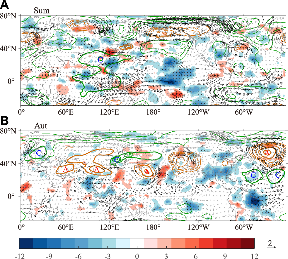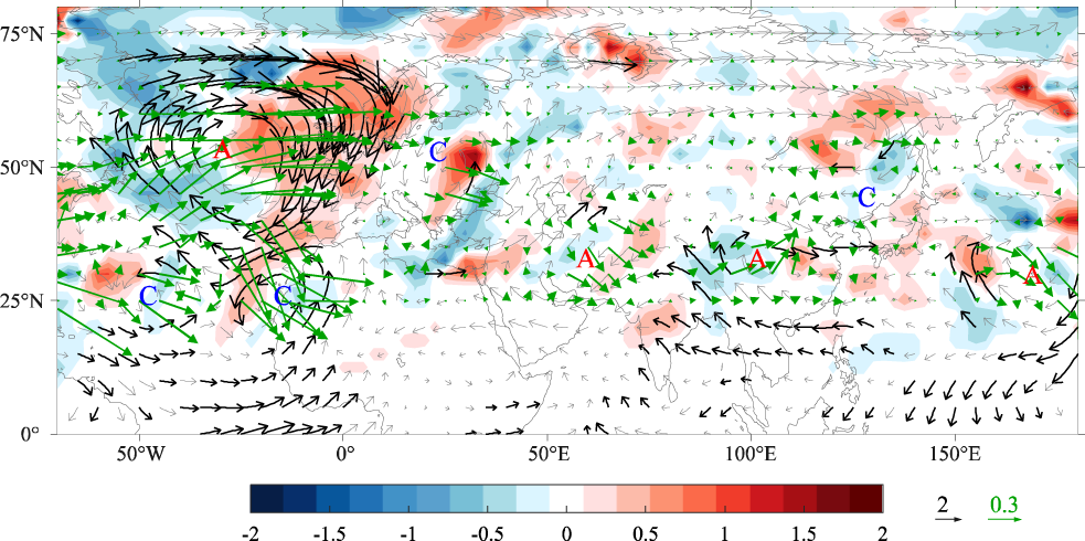 Rossby wave source (shading, 1 × 10–10 s−2), WAF (green vectors, m2 s−2, the data over south of 20°N has been masked) and regressive wind field (black and gray vectors, m s−1), calculated and abstracted from the wind field in Figure 7B. The letter “A” and “C” indicate the centers of anticyclonic/cyclonic anomalies, respectively. Black vectors denote values above the 90% confidence level.