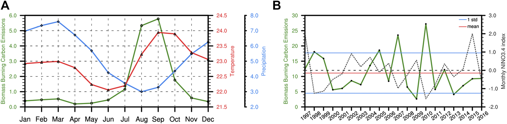 (A) the annual cycle of biomass burning emission (green, g C/m2), total precipitation (blue, mm/day), and temperature (red, C) over Amazon during 1997–2016. (B) the time series of the Amazon carbon emissions (green soild line, g C/m2 ) and Nino3.4 index (dash line, K) of the Amazon fire season (August and September) from 1997 to 2016. Red horizontal line: the mean value of the time series. Blue line: one standard deviation above and below the mean value.