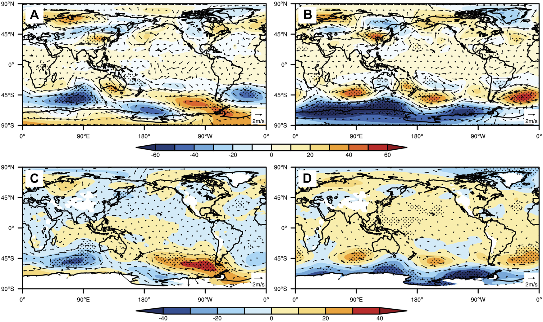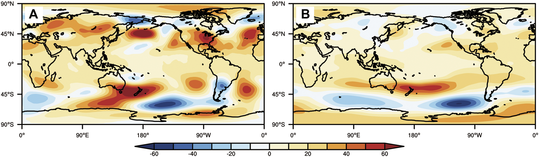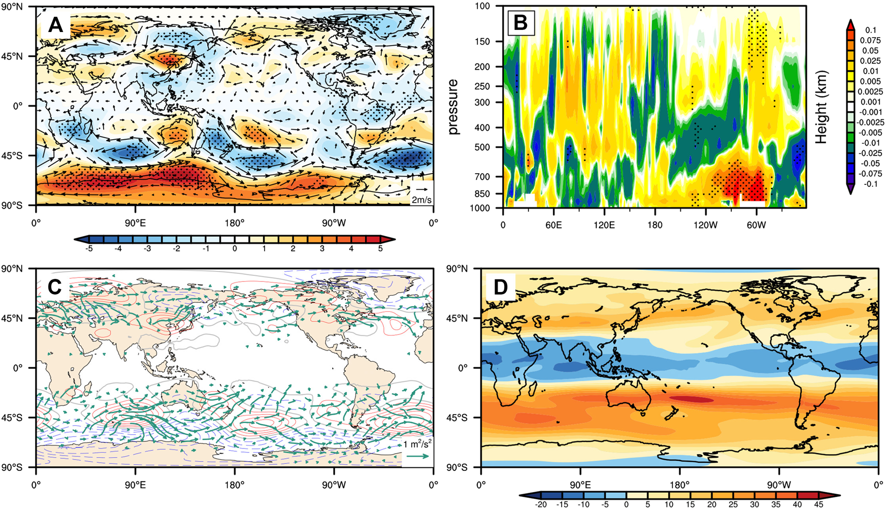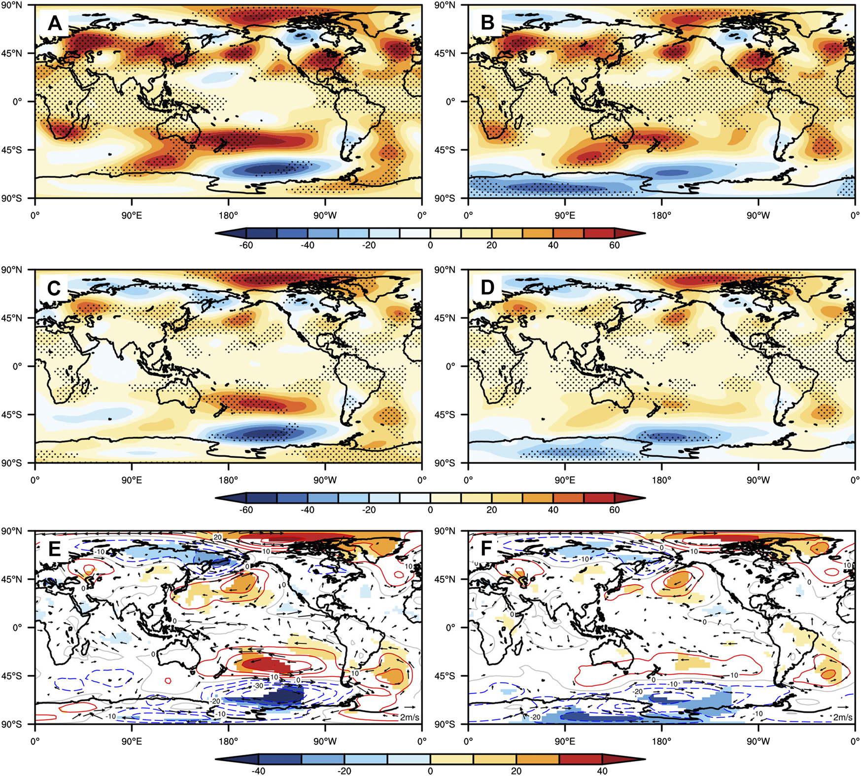 Besides the most significant dipole anomalies, in the mid-high latitudes, there were wave train patterns of anomalies at 200 hPa (Figure 3A), with five waves in the Northern Hemisphere and three waves in the Southern Hemisphere. In the Northern Hemisphere, the five positive anomaly centers were located at Central Europe, Central East Asia, the Aleutian Islands, southern North America, and the Azores. Similar anomalies have been found in previous studies (Shaman and Tziperman, 2005, Zhang et al., 2015a, Zhang et al., 2015b), in which such anomalies were induced by the SSTA in the Pacific instead of aerosols. In the Southern Hemisphere, the three positive anomaly centers were located in southern Africa, the Central South Pacific, and Southwest Atlantic, respectively. All the positive abnormal centers passed the significance test.