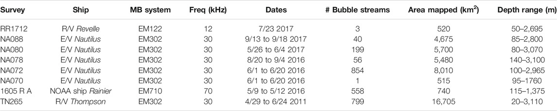 Submarine cold seeps are characterized by particular fauna that rely on methane for chemosynthetic reactions. Initial discoveries of submarine cold seeps were serendipitous. Some of the first cold seep sites were found by the deep submergence vehicle (DSV) Alvin at the base of the Florida escarpment (Paull et al., 1984) and near the toe of the accretionary prism off the Oregon coast (Suess et al., 1985; Kulm et al., 1986). Cold seeps with hydrate exposure and bubble streams at the seafloor were later found at Hydrate Ridge off Oregon (Suess et al., 1999), Barkley Canyon off Vancouver Island (Chapman et al., 2004), and Eel Canyon off northern California (Paull et al., 2014). Later, bubble streams rising through the water column (also called flares) were detected by acoustic single beam sonars (Judd and Hovland, 2008). Johnson et al. (2015) identified 195 known locations of bubble streams and seeps on the Cascadia margin, compiling an inventory based on historic methane emission sites (Carson et al., 1990; Collier and Lilley, 2005; Torres et al., 2009; Salmi et al., 2011), locations of fishermen-reported sonar flares, and University of Washington R/V Thompson EM302 multibeam water column data. The more recent study by Riedel et al. (2018) identified an additional 929 bubble stream locations, with the majority of sites on the British Columbia and northern Washington margins. A large portion of the latter were located with EK60 single-beam sonar during the U.S. National Marine Fishery Service fishery stock assessment surveys on the west coast.